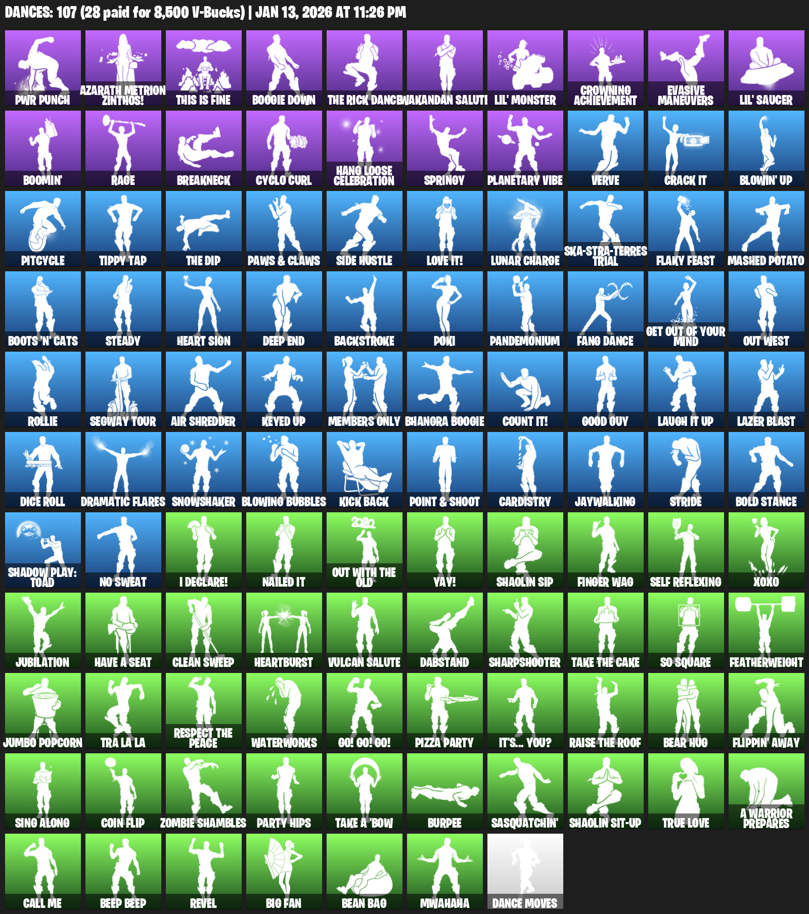 PWR Punch, Azarath Metrion Zinthos!, This is Fine, Boogie Down, Wakandan Salute, Lil’ Monster, Crowning Achievement, Evasive Maneuvers, Boomin’, Rage, Breakneck, Cyclo Curl, Hang Loose Celebration, Springy, Planetary Vibe, Verve, Crack It, Blowin’ Up