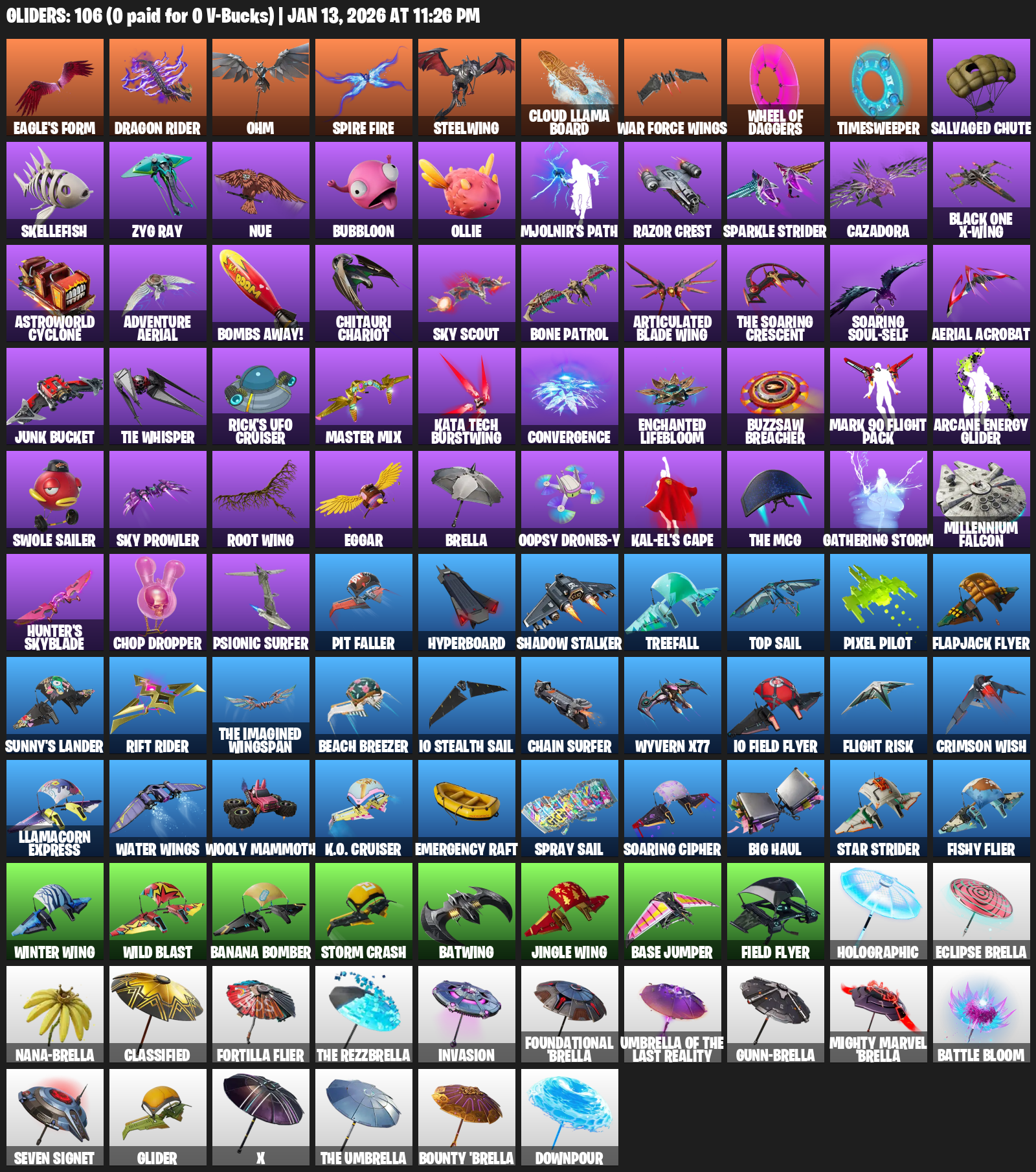 Eagle’s Form, Dragon Rider, Ohm, Spire Fire, Steelwing, Cloud Llama Board, War Force Wings, Timesweeper, Salvaged Chute, Skellefish, Zyg Ray, Nue, Bubbloon, Ollie, Mjolnir’s Path, Razor Crest, Sparkle Strider, Cazadora, Black One X-wing