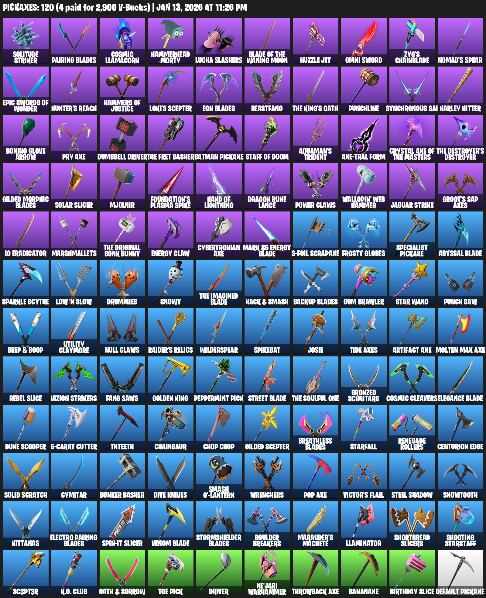 Solitude Striker, Pairing Blades, Cosmic Llamacorn, Hammerhead Morty, Lucha Slashers, Nuzzle Jet, Omni Sword, Zyg’s Chainblade, Nomad’s Spear, Hunter’s Reach, Hammers of Justice, Loki’s Scepter, Beastfang, Punchline, Synchronous Sai, Harley Hitter