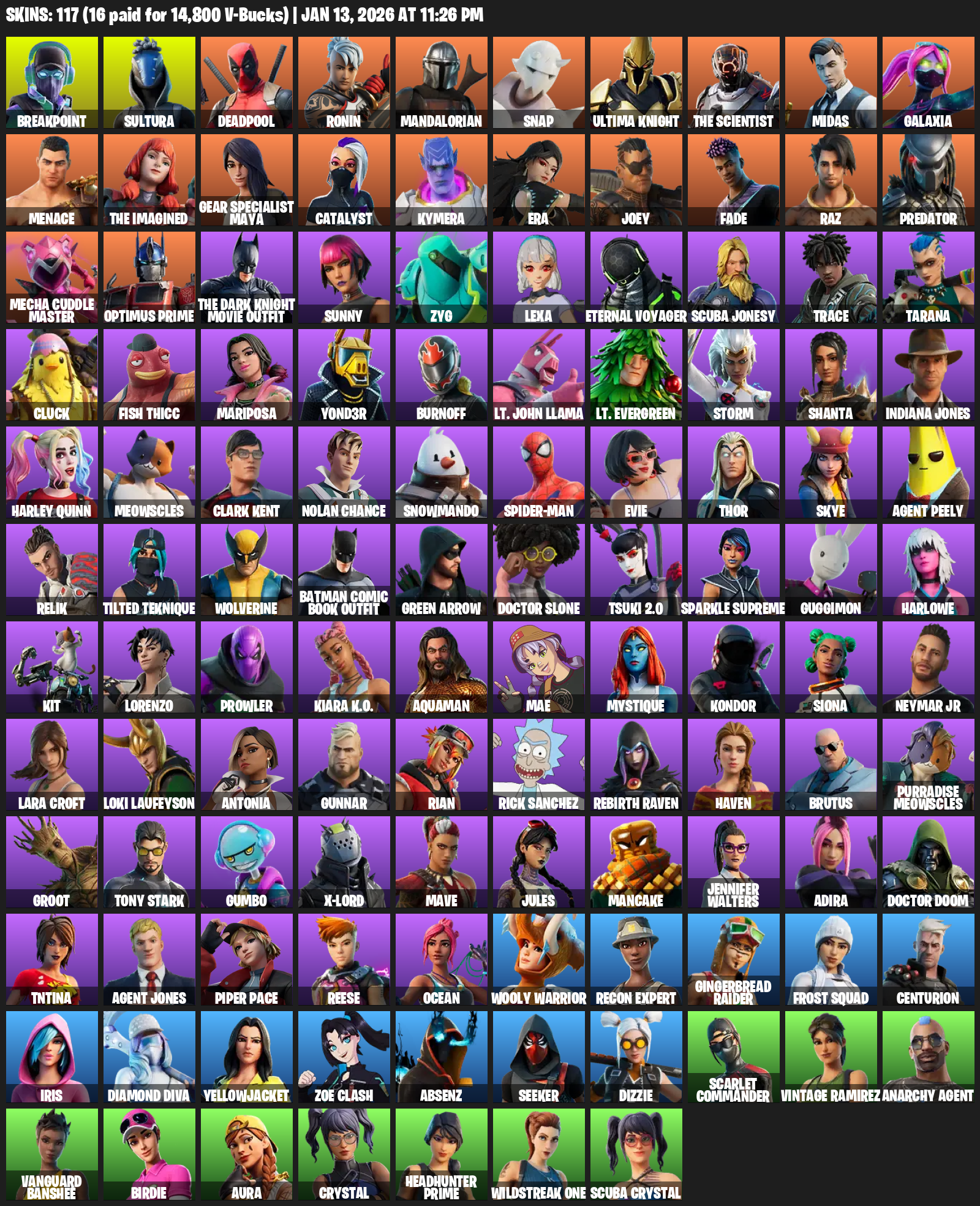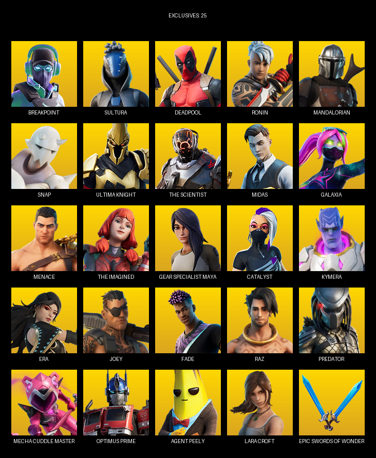 Gear Specialist Maya, Lara Croft, Breakpoint, Sultura, Deadpool, Ronin, Mandalorian, Snap, Ultima Knight, The Scientist, Midas, Galaxia, Menace, Catalyst, Kymera, Era, Joey, Fade, Raz