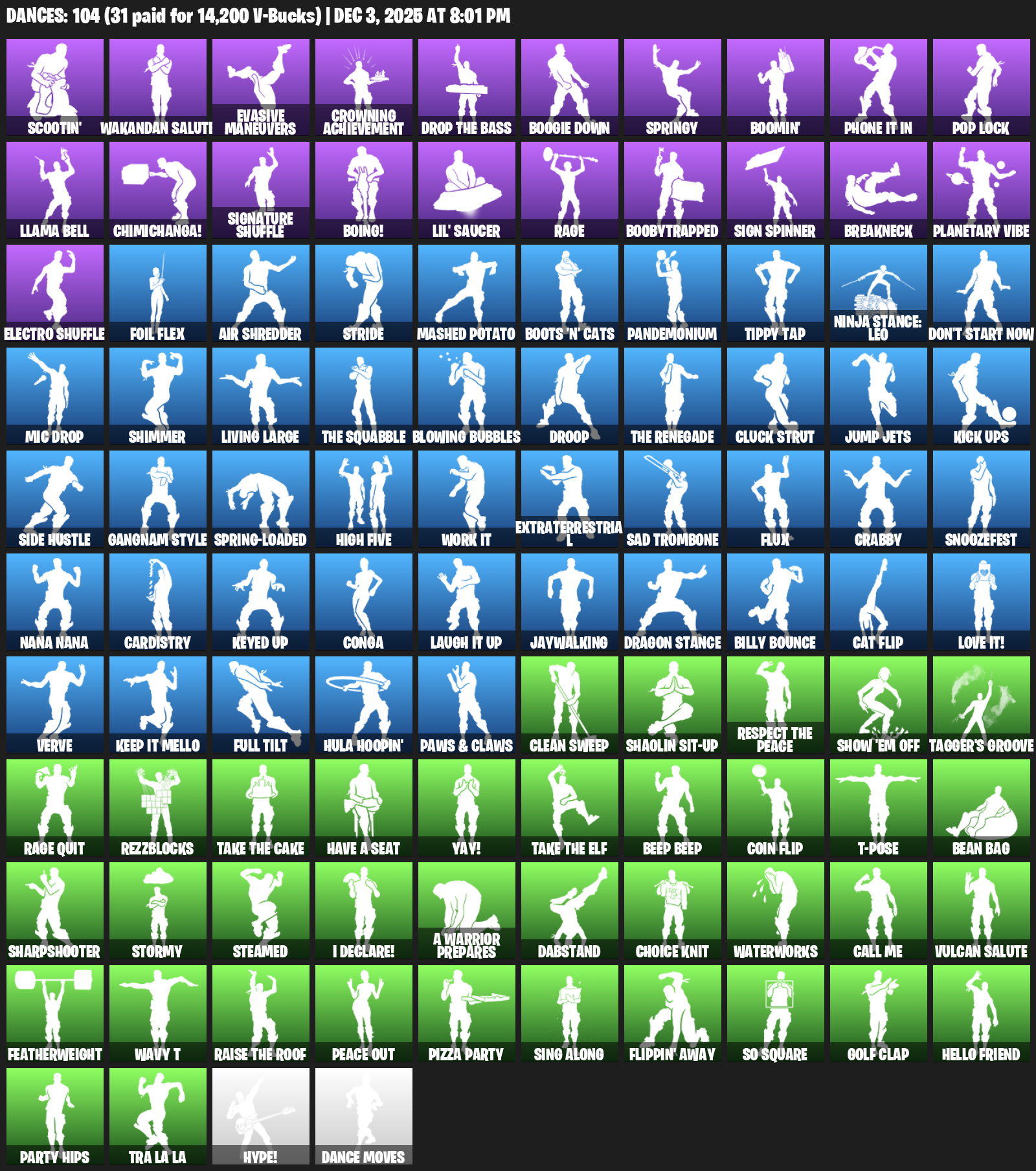 Scootin’, Wakandan Salute, Evasive Maneuvers, Crowning Achievement, Boogie Down, Springy, Boomin’, Phone It In, Pop Lock, Llama Bell, Chimichanga!, Signature Shuffle, Boing!, Lil’ Saucer, Rage, Boobytrapped, Sign Spinner, Breakneck, Planetary Vibe