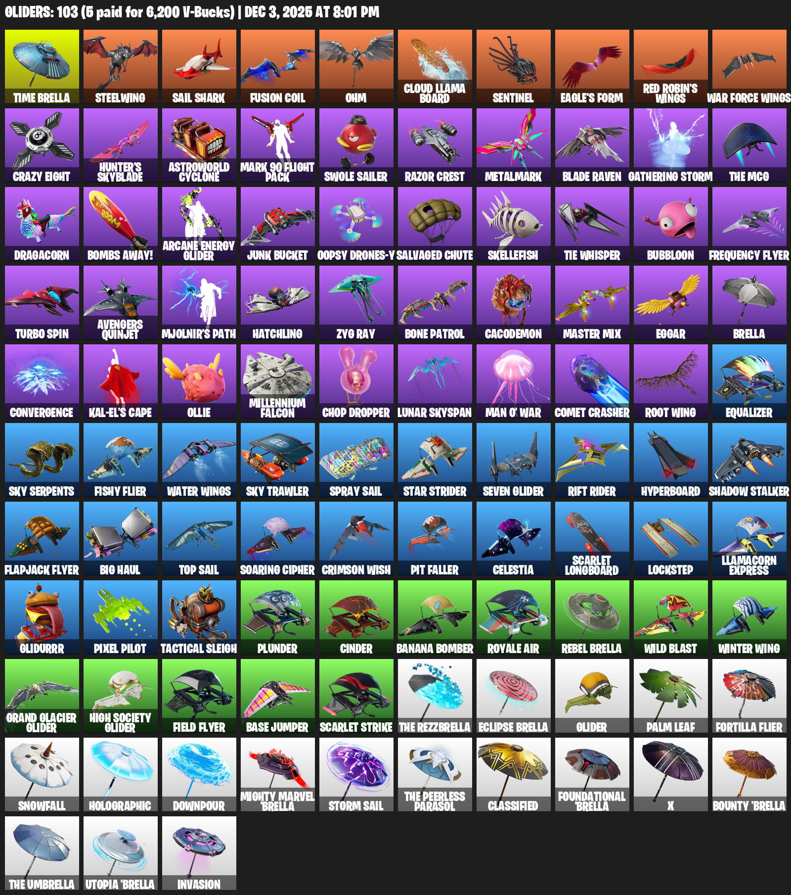 Time Brella, Steelwing, Sail Shark, Ohm, Eagle’s Form, Red Robin’s Wings, Crazy Eight, Hunter’s Skyblade, Astroworld Cyclone, Mark 90 Flight Pack, Swole Sailer, Razor Crest, Metalmark, Gathering Storm