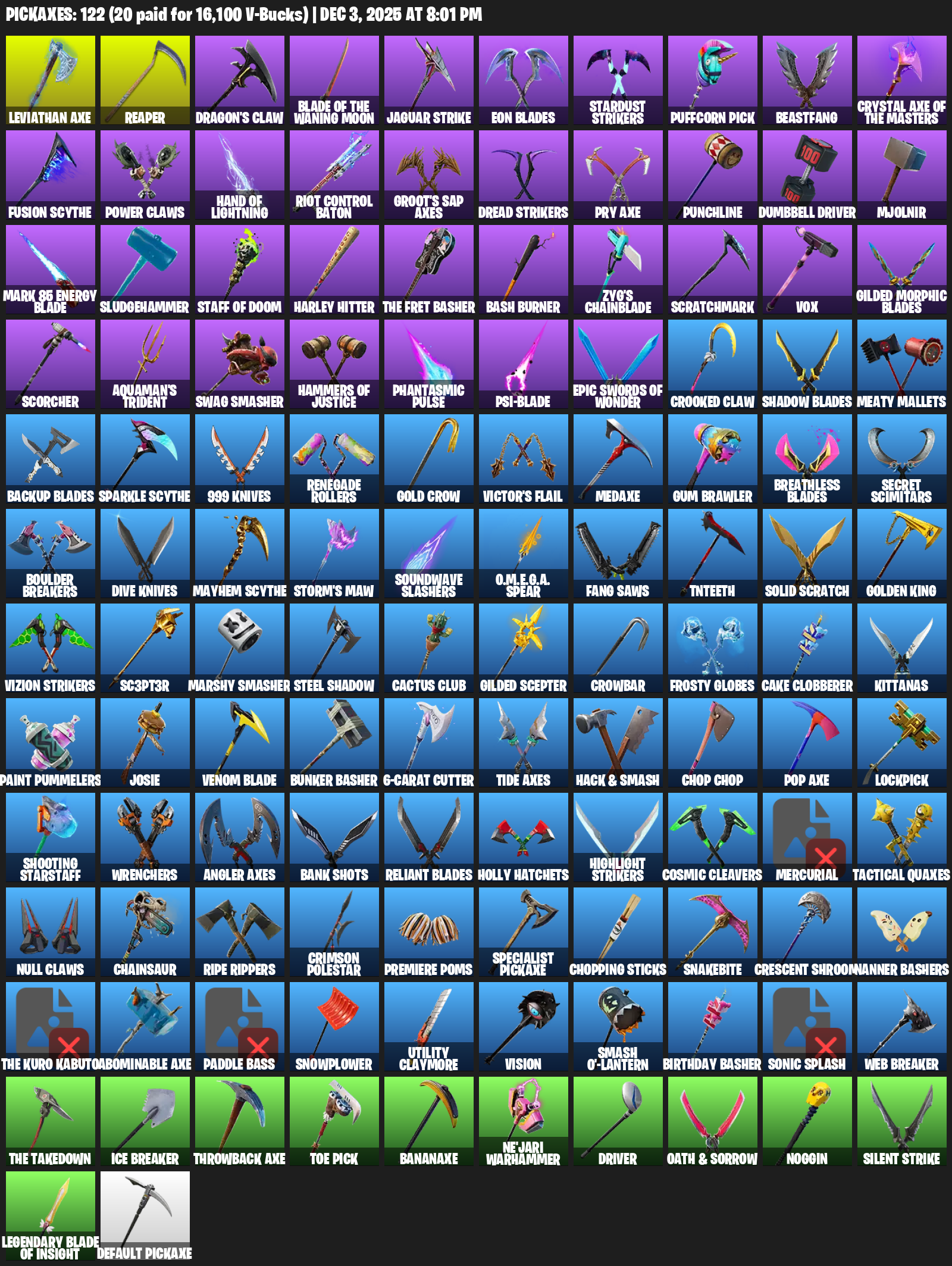 Leviathan Axe, Reaper, Dragon’s Claw, Blade of the Waning Moon, Jaguar Strike, Eon Blades, Stardust Strikers, Puffcorn Pick, Beastfang, Power Claws, Riot Control Baton, Groot’s Sap Axes, Punchline, Dumbbell Driver, Mjolnir