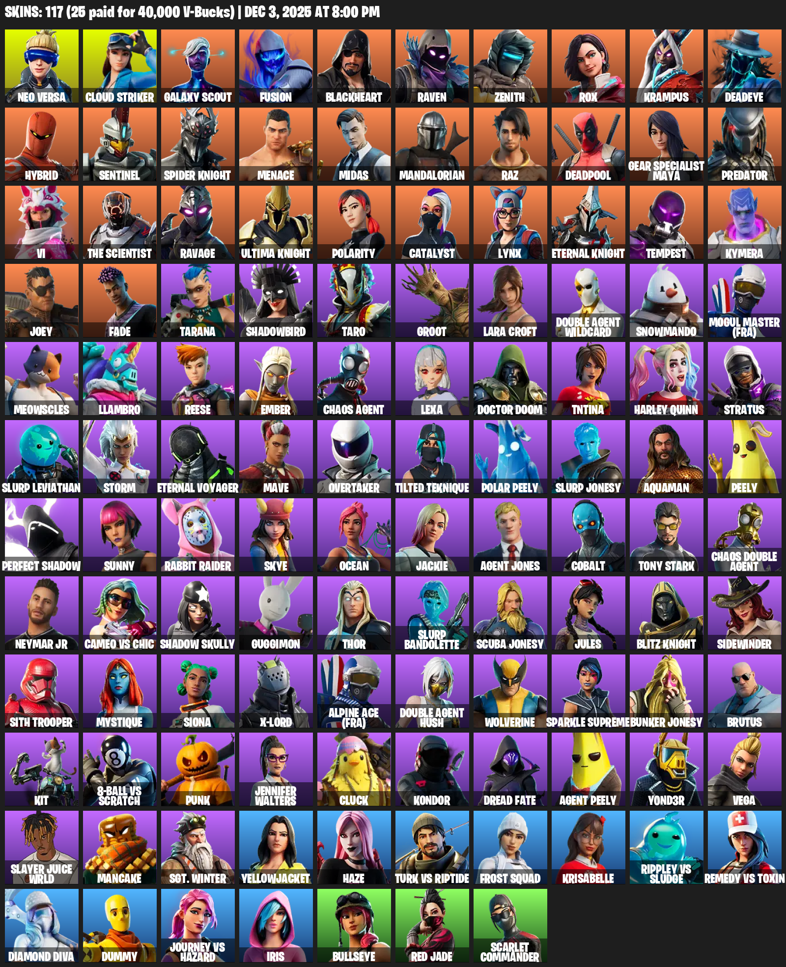 Gear Specialist Maya, Lara Croft, Neo Versa, Cloud Striker, Galaxy Scout, Fusion, Blackheart, Raven, Zenith, Rox, Krampus, Deadeye, Hybrid, Sentinel, Spider Knight, Menace, Midas, Mandalorian, Raz, Deadpool