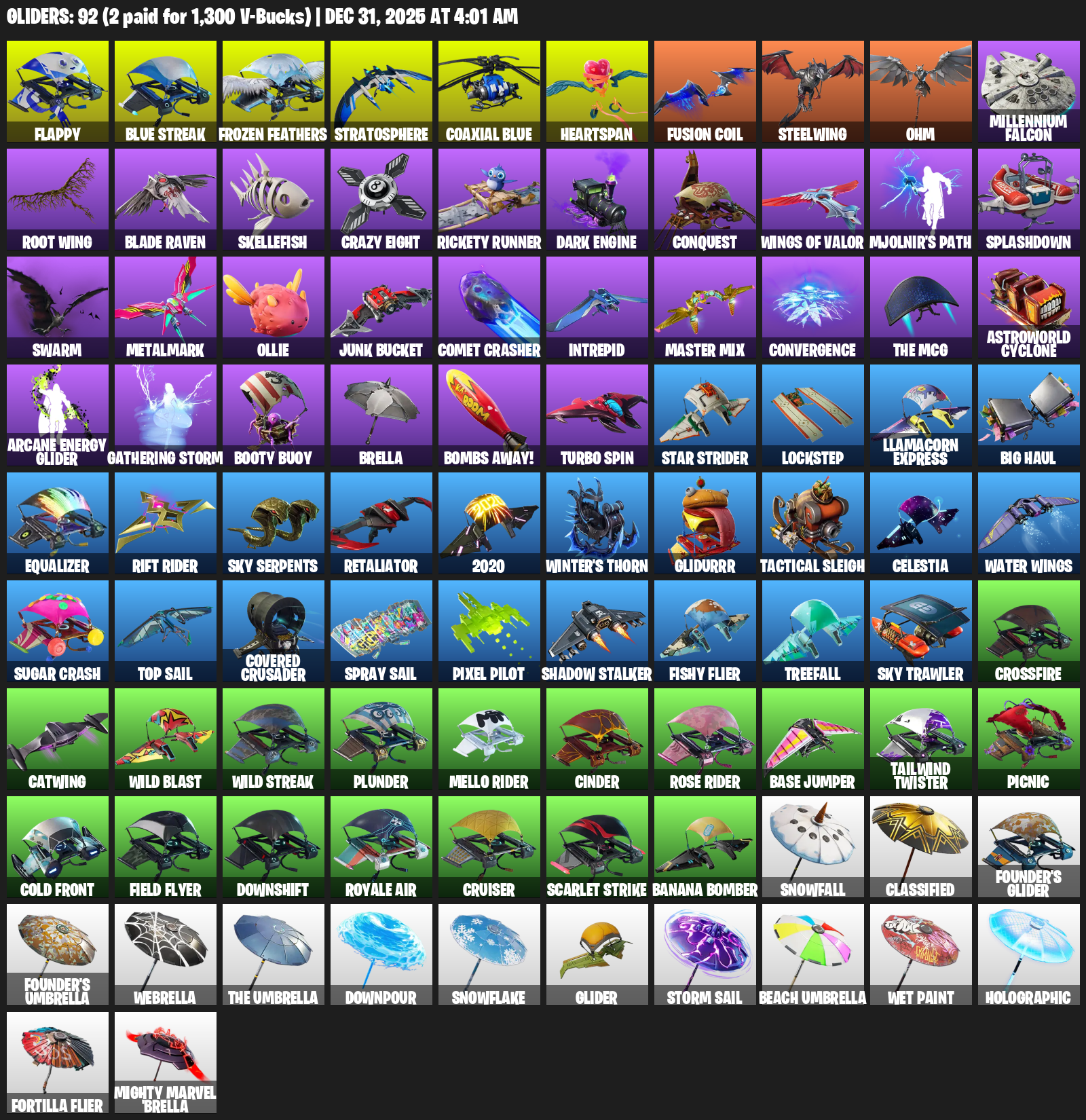 Flappy, Frozen Feathers, Stratosphere, Heartspan, Steelwing, Ohm, Millennium Falcon, Root Wing, Blade Raven, Skellefish, Crazy Eight, Rickety Runner, Dark Engine, Conquest, Mjolnir’s Path, Splashdown