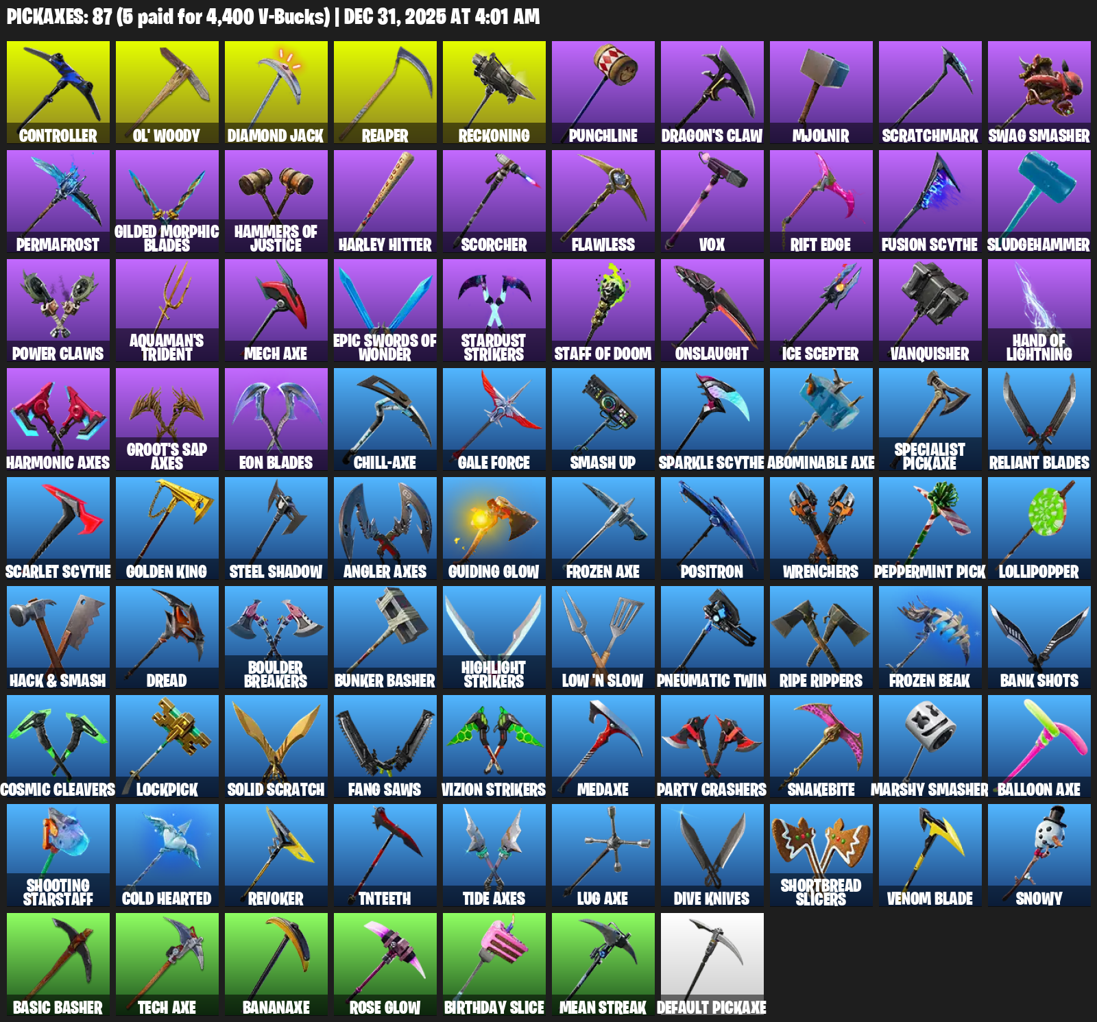 Controller, Ol’ Woody, Reaper, Reckoning, Punchline, Dragon’s Claw, Mjolnir, Scratchmark, Swag Smasher, Permafrost, Gilded Morphic Blades, Hammers of Justice, Harley Hitter, Scorcher, Flawless, Vox, Rift Edge, Sludgehammer