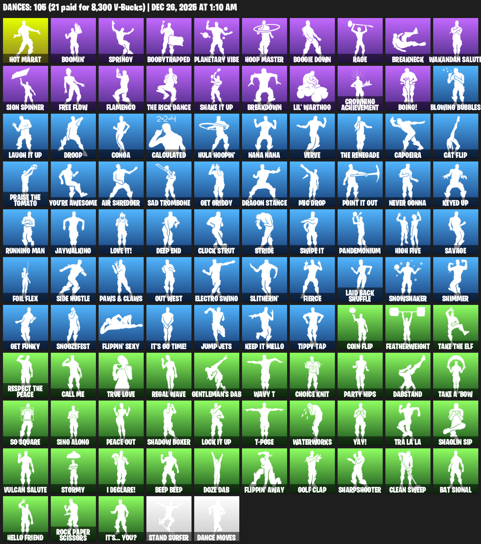 Hot Marat, Boomin’, Springy, Boobytrapped, Planetary Vibe, Hoop Master, Boogie Down, Rage, Breakneck, Wakandan Salute, Sign Spinner, Free Flow, Flamenco, Shake It Up, Breakdown, Lil’ Warthog, Crowning Achievement, Boing!, Blowing Bubbles
