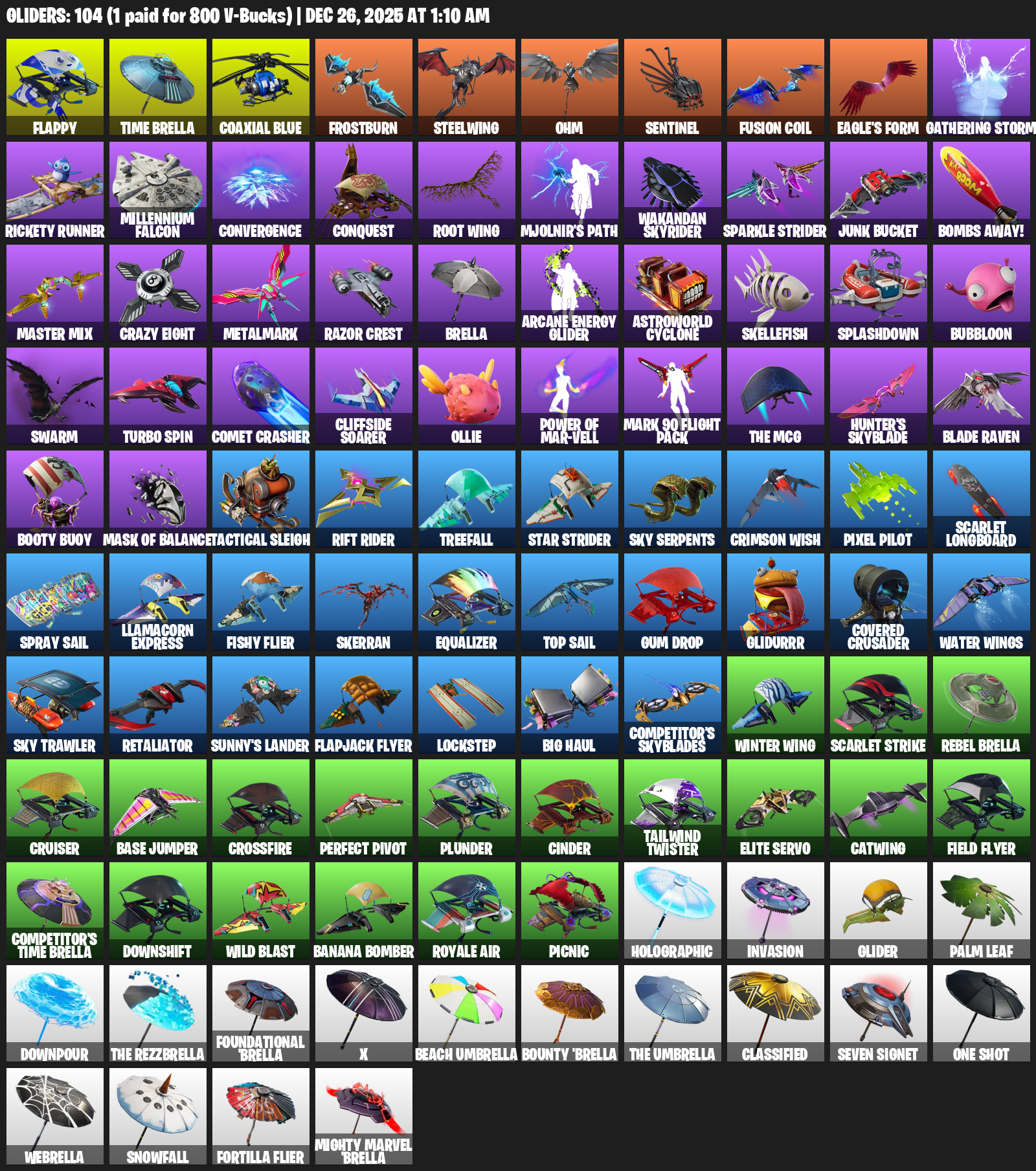 Flappy, Time Brella, Frostburn, Steelwing, Ohm, Eagle’s Form, Gathering Storm, Rickety Runner, Millennium Falcon, Convergence, Conquest, Root Wing, Mjolnir’s Path, Sparkle Strider, Junk Bucket, Bombs Away!