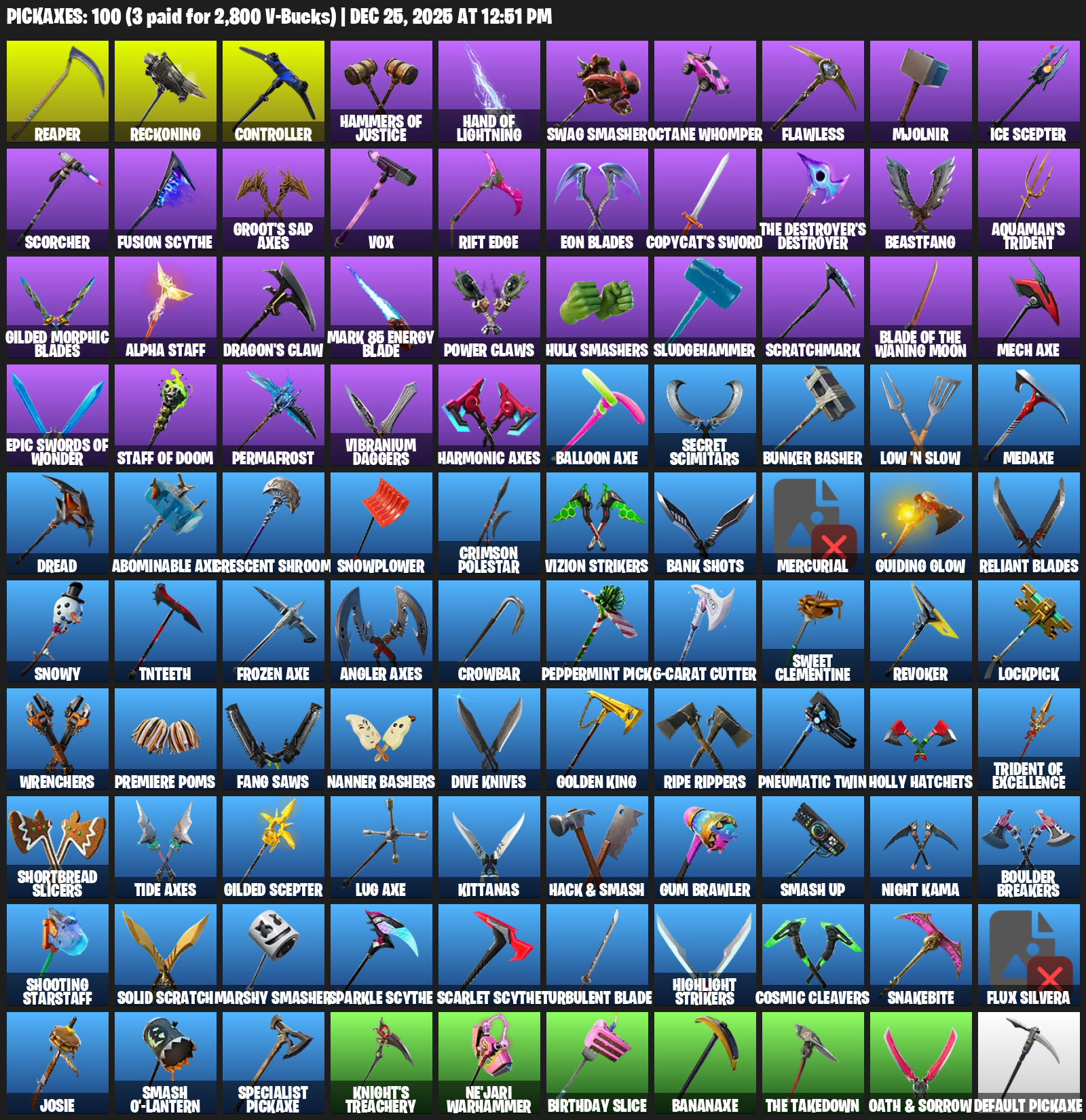 Reaper, Reckoning, Controller, Hammers of Justice, Swag Smasher, Octane Whomper, Flawless, Mjolnir, Ice Scepter, Scorcher, Fusion Scythe, Groot’s Sap Axes, Vox, Rift Edge, Eon Blades, Copycat’s Sword, Beastfang, Aquaman’s Trident