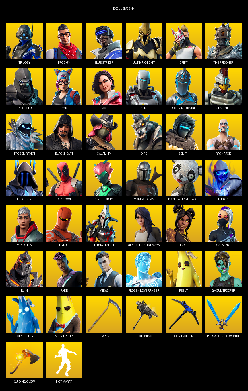 HomeFortnite AccountsPeely [PC/XBOX] | 117 skins | Reaper Axe | Trilogy | Prodigy | Blue Striker | Ultima Knight | Drift | The Prisoner | Enforcer | Lynx | Rox | #DNM3290