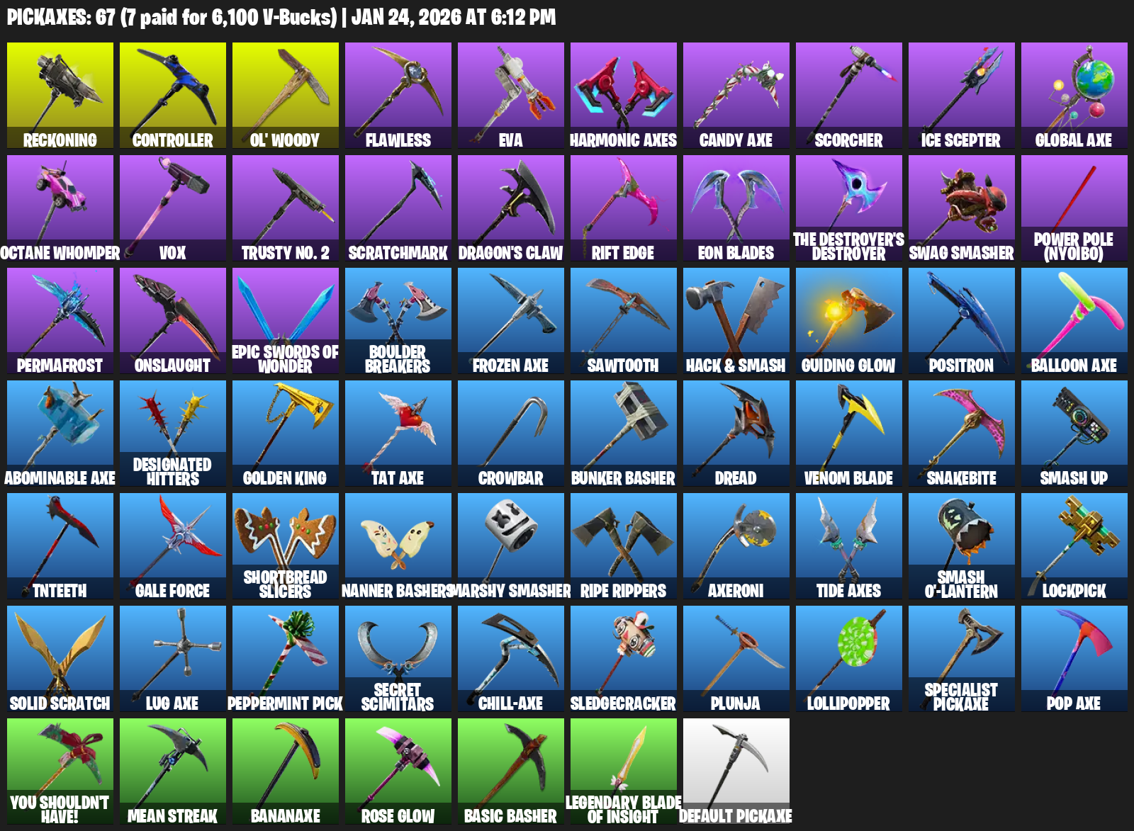 Reckoning, Controller, Ol’ Woody, Flawless, EVA, Harmonic Axes, Candy Axe, Scorcher, Ice Scepter, Octane Whomper, Vox, Trusty No. 2, Scratchmark, Dragon’s Claw, Rift Edge, Eon Blades, Swag Smasher, Power Pole (Nyoibo)