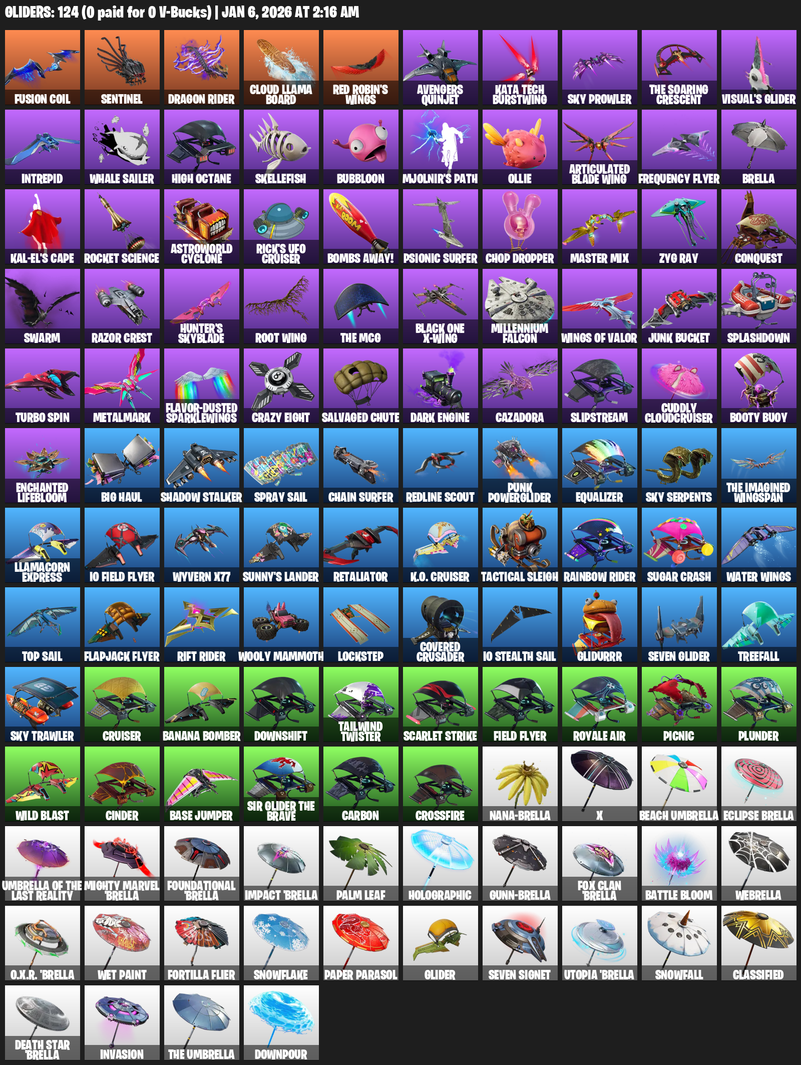 Fusion Coil, Sentinel, Dragon Rider, Cloud Llama Board, Red Robin’s Wings, Avengers Quinjet, Kata Tech Burstwing, Sky Prowler, Visual’s Glider, Intrepid, Whale Sailer, High Octane, Skellefish, Bubbloon, Mjolnir’s Path, Ollie, Frequency Flyer, Brella