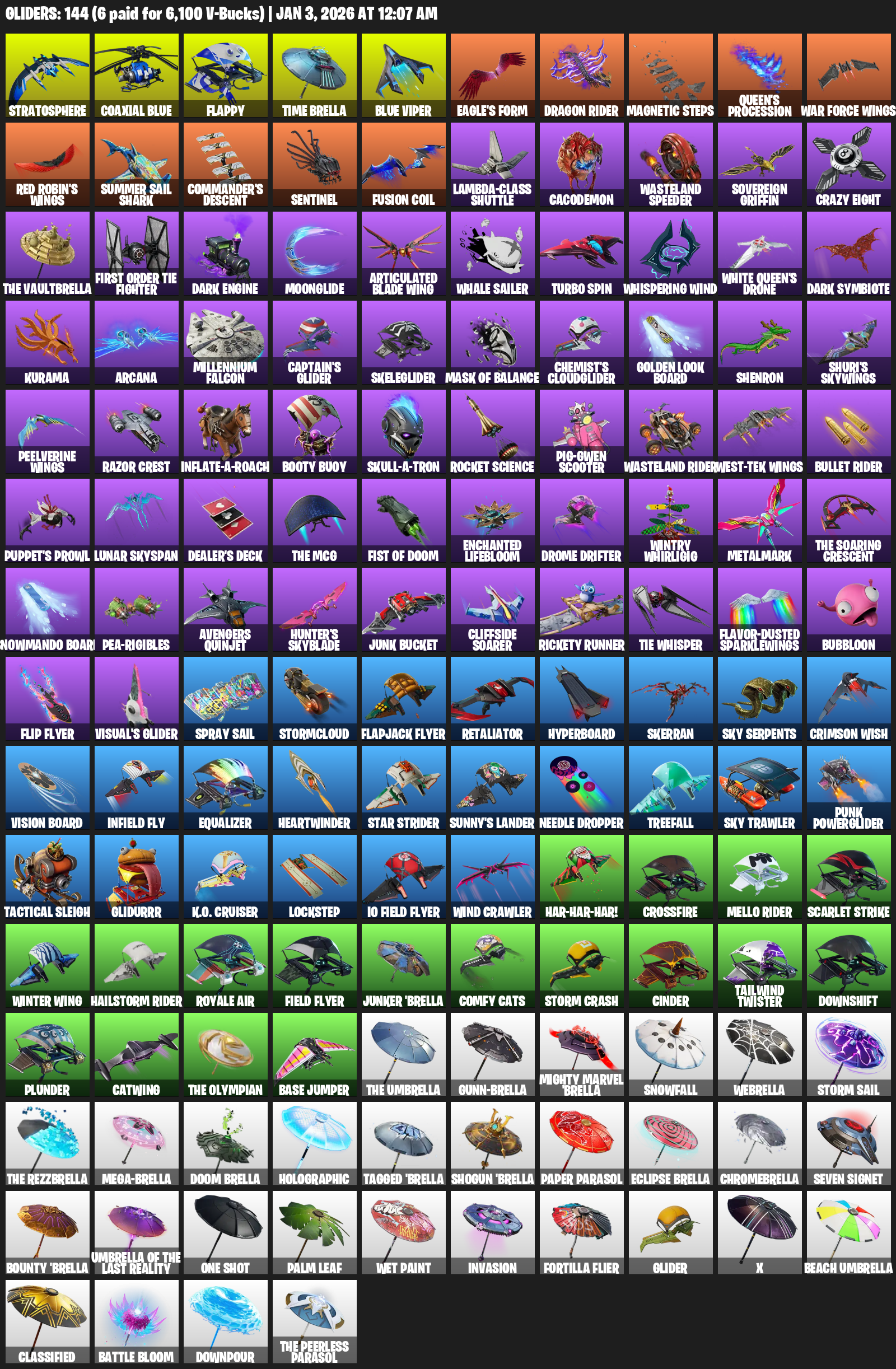 Stratosphere, Flappy, Time Brella, Eagle’s Form, Magnetic Steps, Queen’s Procession, War Force Wings, Summer Sail Shark, Commander’s Descent, Sentinel, Fusion Coil, Lambda-Class Shuttle, Cacodemon, Wasteland Speeder, Sovereign Griffin, Crazy Eight