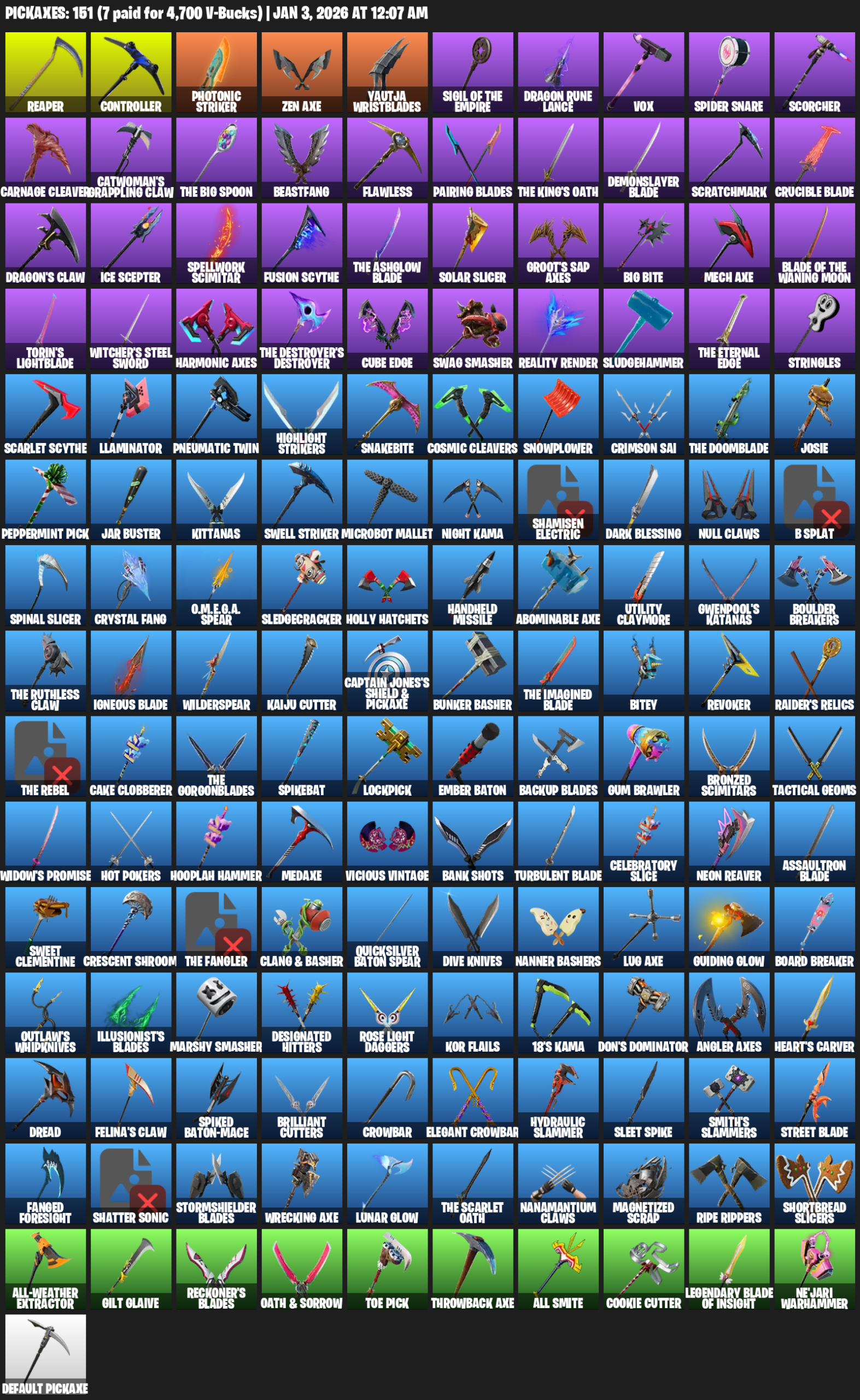 Reaper, Controller, Zen Axe, Yautja Wristblades, Dragon Rune Lance, Vox, Spider Snare, Scorcher, Carnage Cleaver, Catwoman’s Grappling Claw, Beastfang, Flawless, Pairing Blades, Demonslayer Blade, Scratchmark