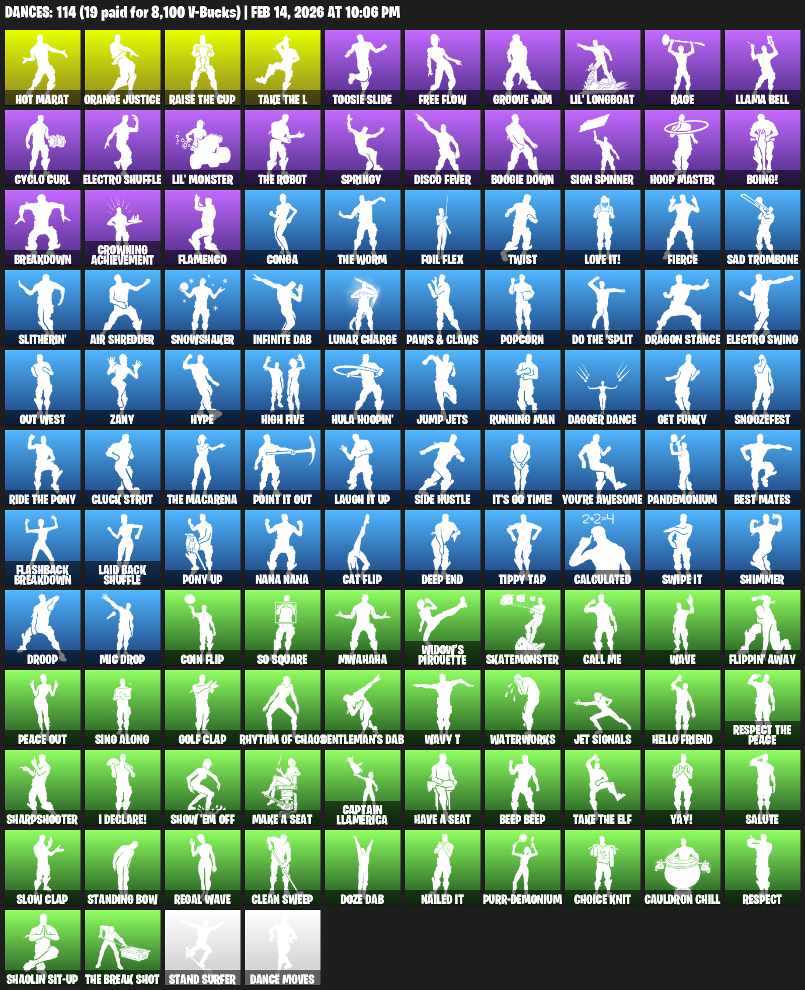 Hot Marat, Orange Justice, Toosie Slide, Free Flow, Groove Jam, Lil’ Longboat, Rage, Llama Bell, Cyclo Curl, Electro Shuffle, Springy , Disco Fever, Boogie Down, Sign Spinner, Hoop Master, Boing!
