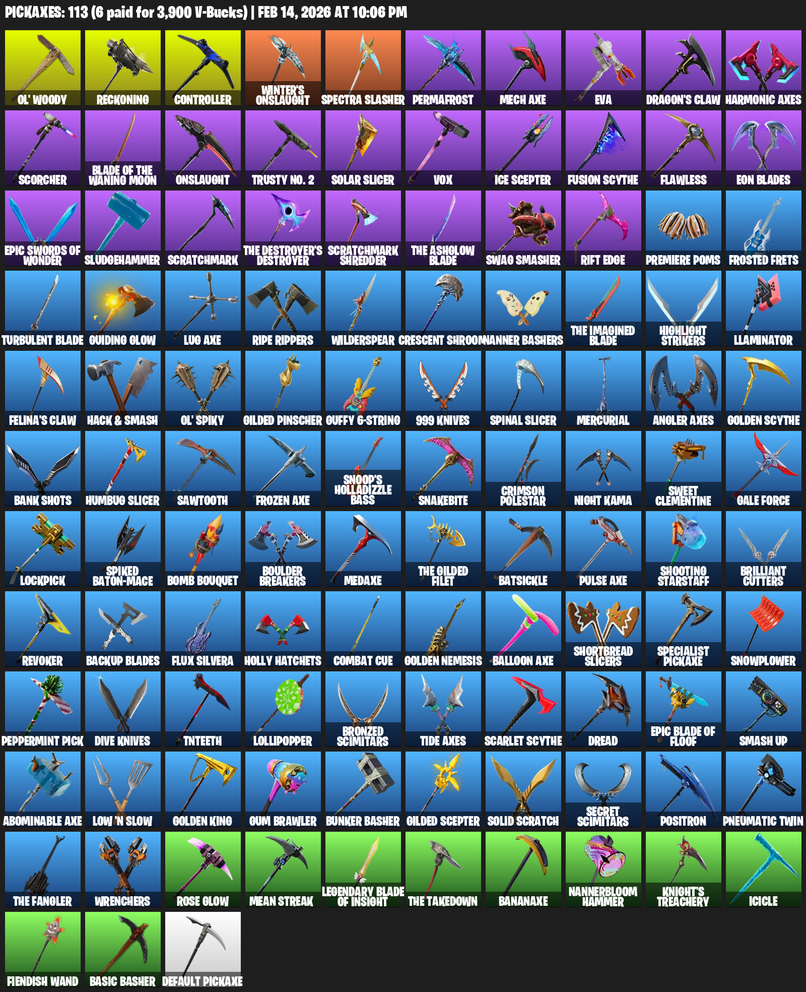 Ol’ Woody, Reckoning, Controller, Winter’s Onslaught, Spectra Slasher, Permafrost, Mech Axe, EVA, Dragon’s Claw, Harmonic Axes, Scorcher, Trusty No. 2, Solar Slicer, Vox, Ice Scepter, Fusion Scythe, Flawless, Eon Blades