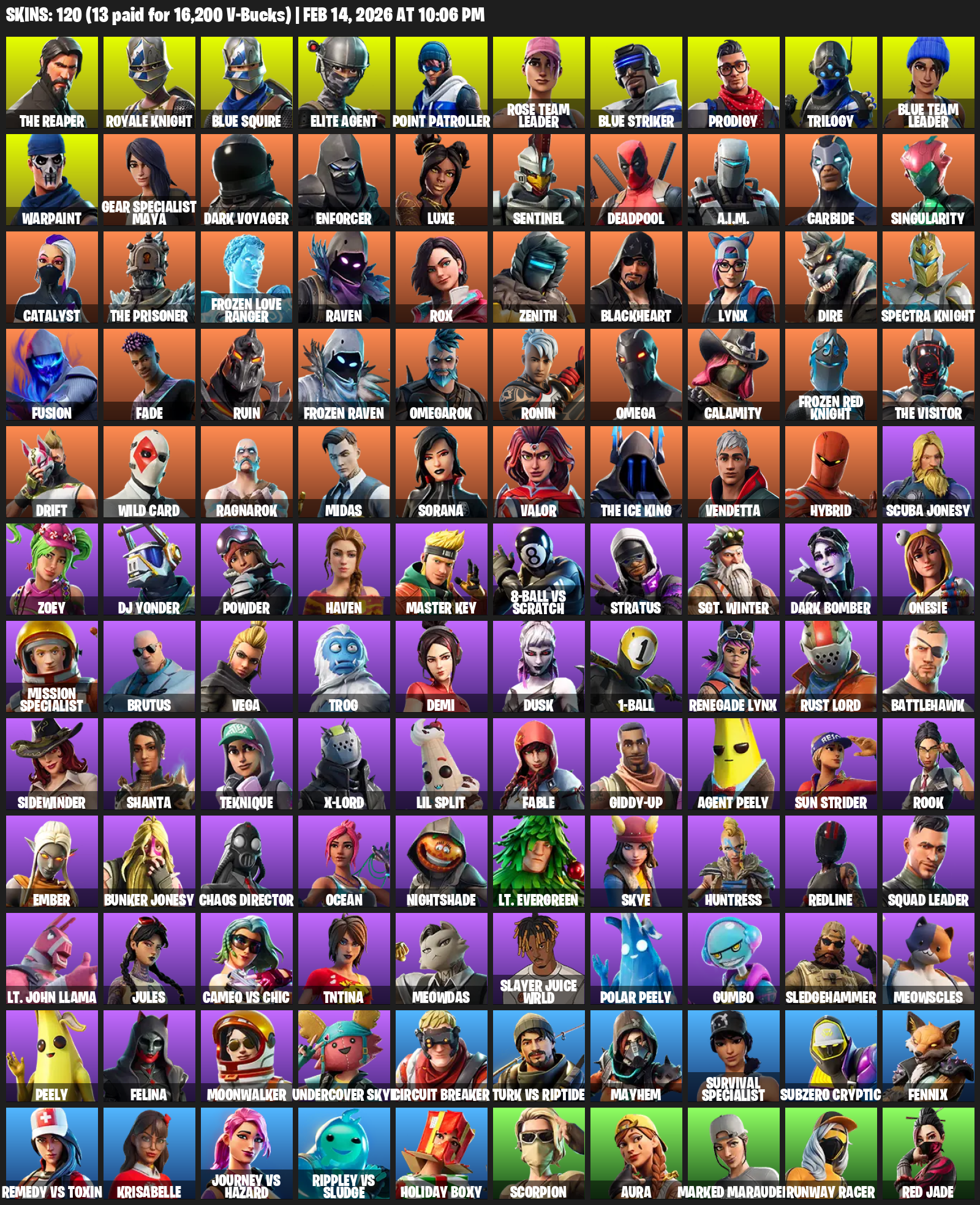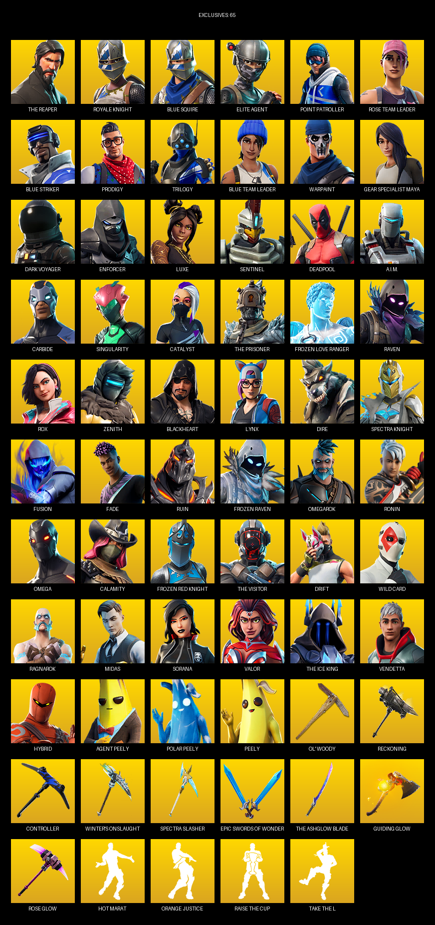 The Reaper, Royale Knight, Blue Squire, Elite Agent, Point Patroller, Gear Specialist Maya, Omega, Rose Team Leader, Prodigy, Trilogy, Warpaint, Dark Voyager, Enforcer, Luxe, Sentinel, Deadpool, A.I.M., Carbide