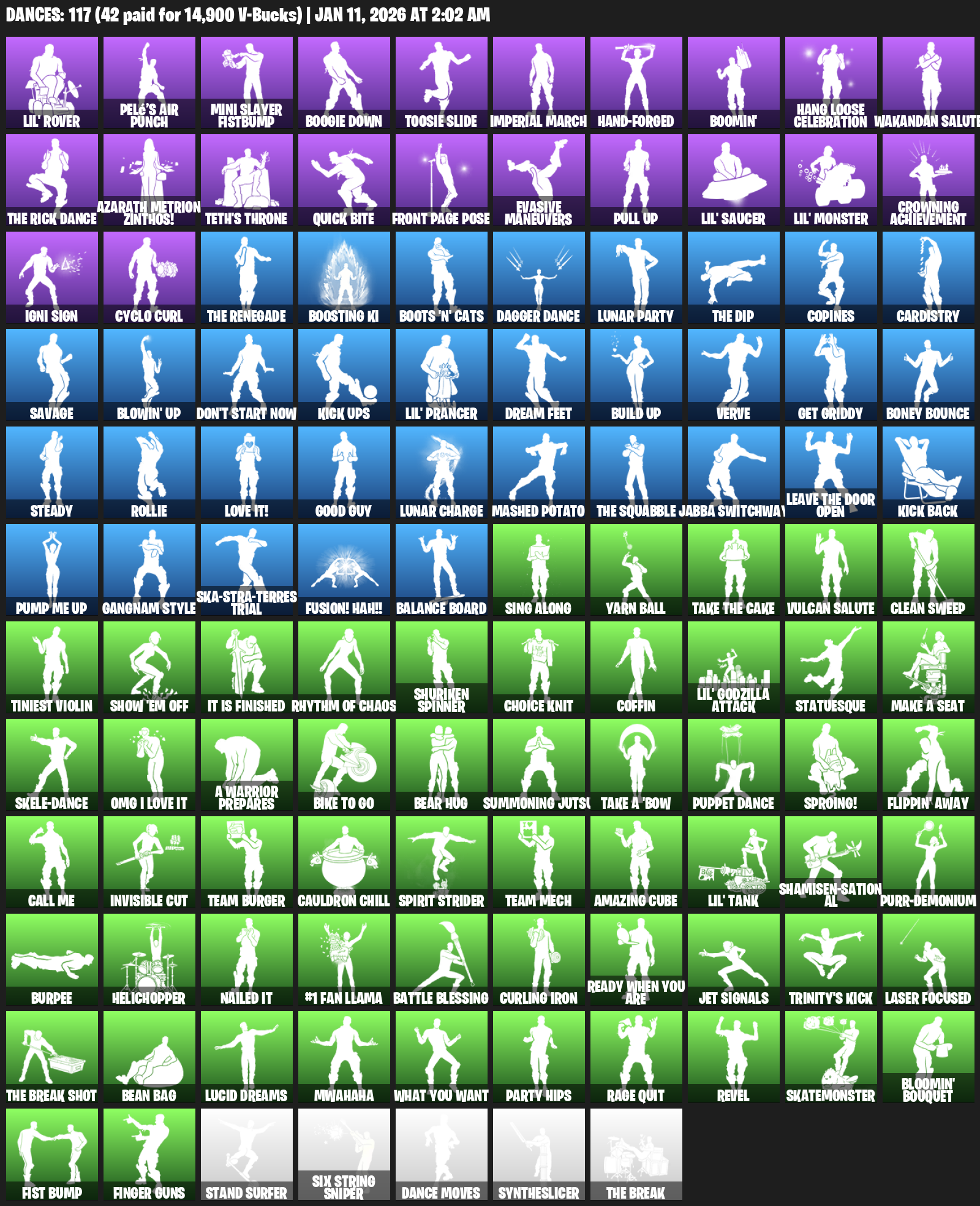 Lil’ Rover, Pelé’s Air Punch, Mini Slayer Fistbump, Boogie Down, Toosie Slide, Imperial March, Hand-Forged, Boomin’, Hang Loose Celebration, Wakandan Salute, Azarath Metrion Zinthos!, Teth’s Throne, Quick Bite, Front Page Pose, Evasive Maneuvers, Pull Up, Crowning Achievement