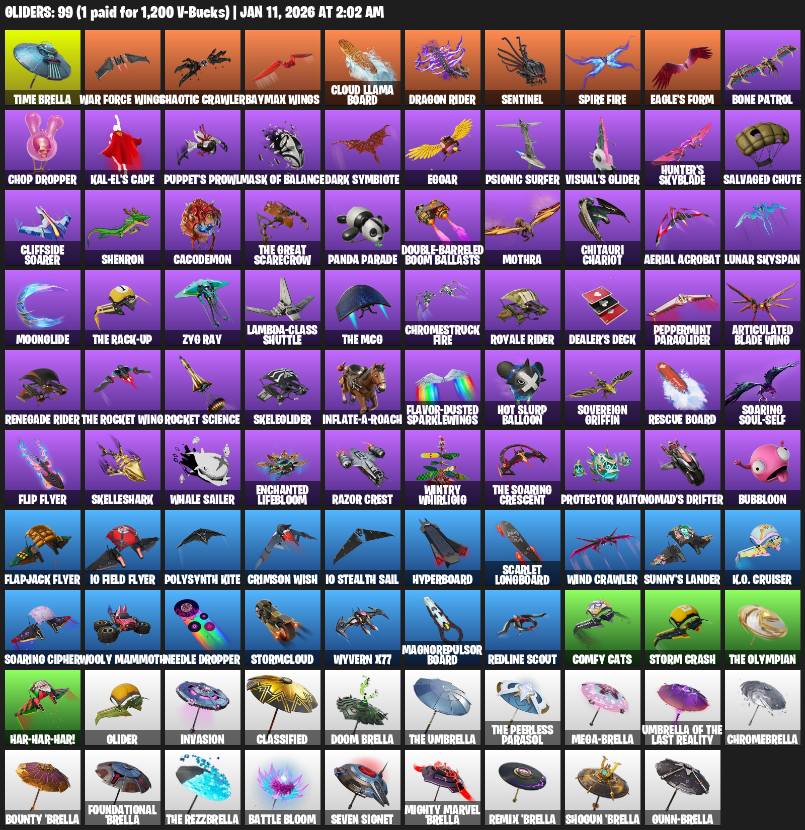 Time Brella, War Force Wings, Chaotic Crawler, Dragon Rider, Sentinel, Eagle’s Form, Bone Patrol, Chop Dropper, Kal-El’s Cape, Puppet’s Prowl, Mask of Balance, Dark Symbiote, Eggar, Psionic Surfer, Visual’s Glider, Hunter’s Skyblade, Salvaged Chute