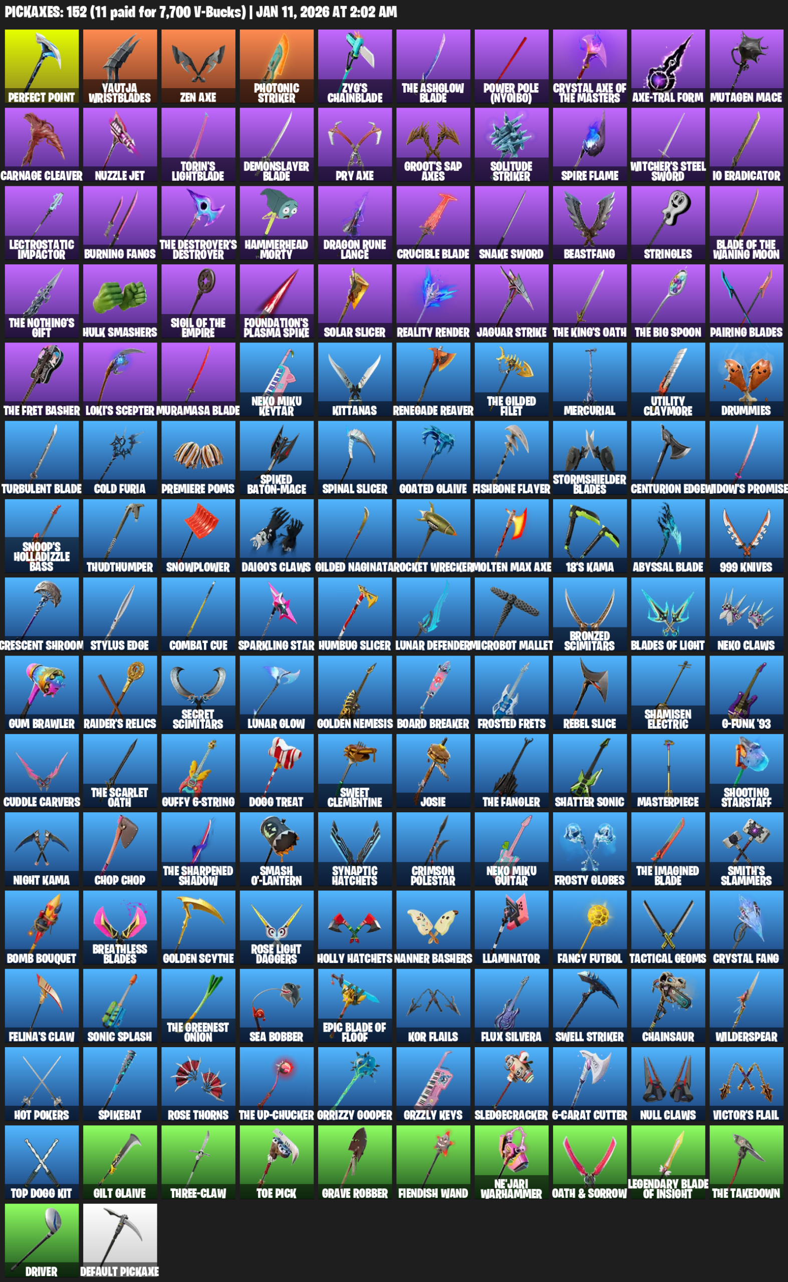 Perfect Point, Yautja Wristblades, Zen Axe, Zyg’s Chainblade, Power Pole (Nyoibo), Mutagen Mace, Carnage Cleaver, Nuzzle Jet, Torin’s Lightblade, Demonslayer Blade, Groot’s Sap Axes, Witcher’s Steel Sword, IO Eradicator