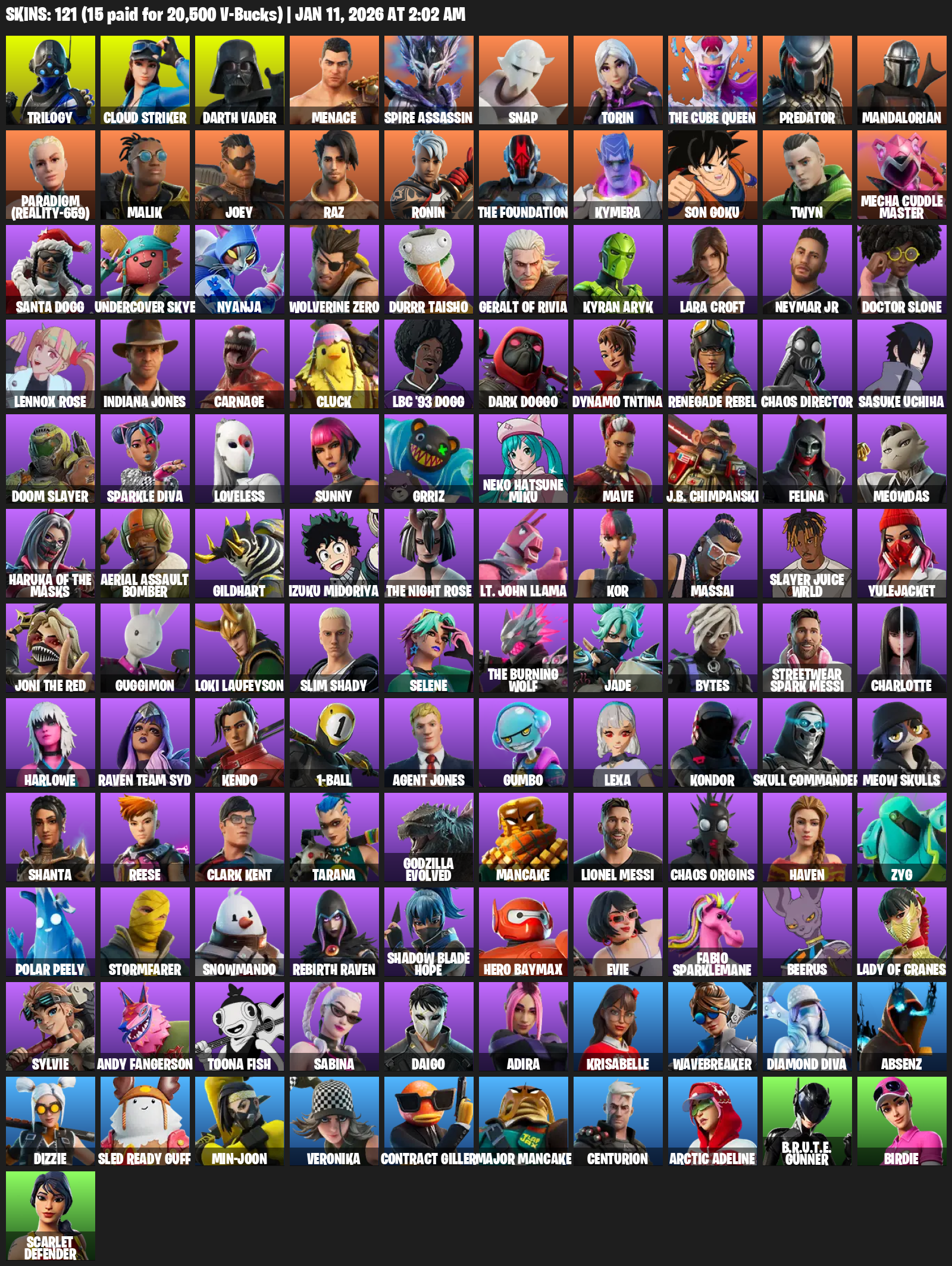 Lara Croft, Trilogy, Cloud Striker, Darth Vader, Menace, Spire Assassin, Snap, Torin, The Cube Queen, Predator, Mandalorian, Paradigm (Reality-659), Malik, Joey, Raz, Ronin, Kymera, Son Goku, Twyn