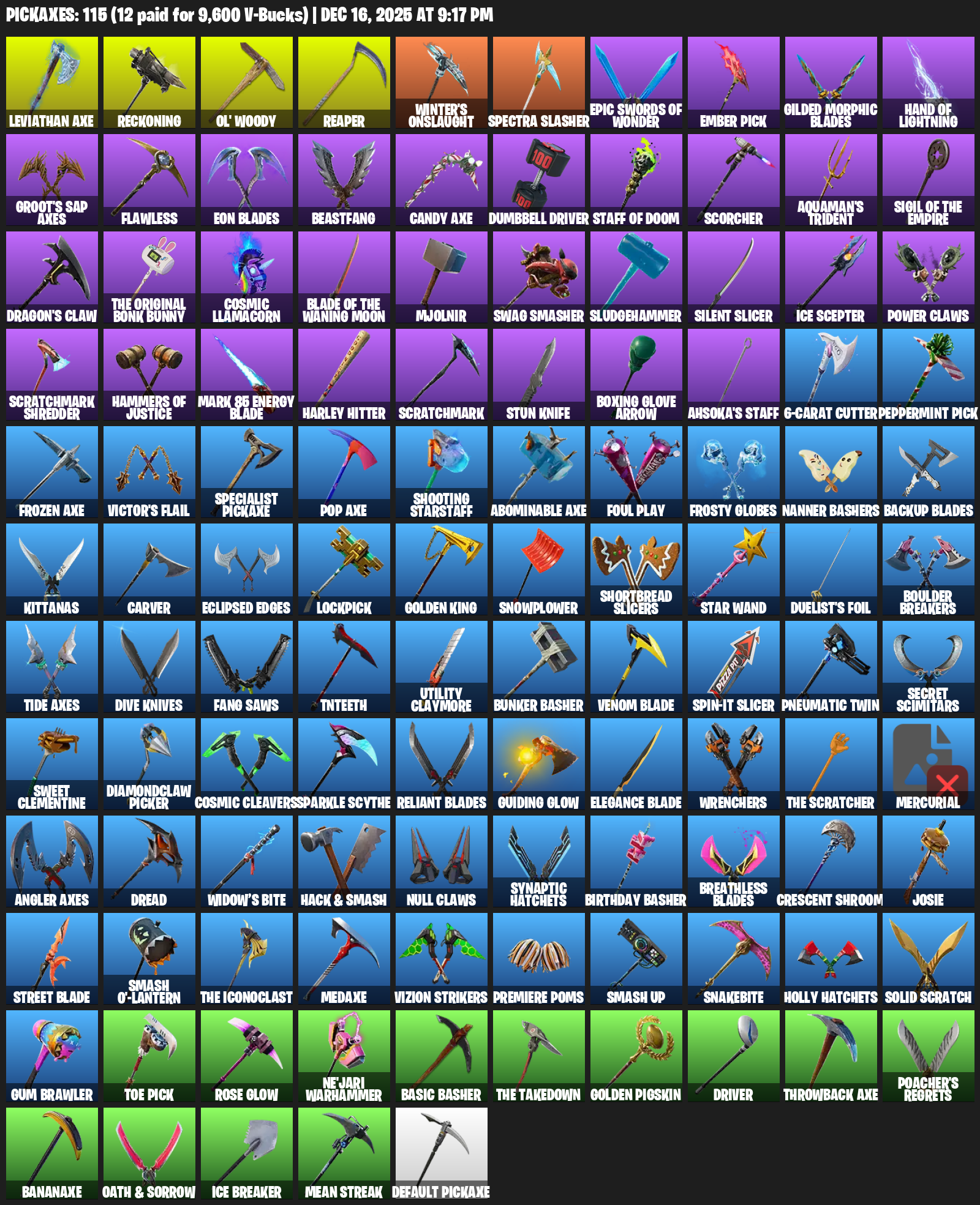 Leviathan Axe, Reckoning, Ol’ Woody, Reaper, Winter’s Onslaught, Ember Pick, Gilded Morphic Blades, Hand of Lightning, Groot’s Sap Axes, Flawless, Beastfang, Dumbbell Driver, Scorcher, Aquaman’s Trident