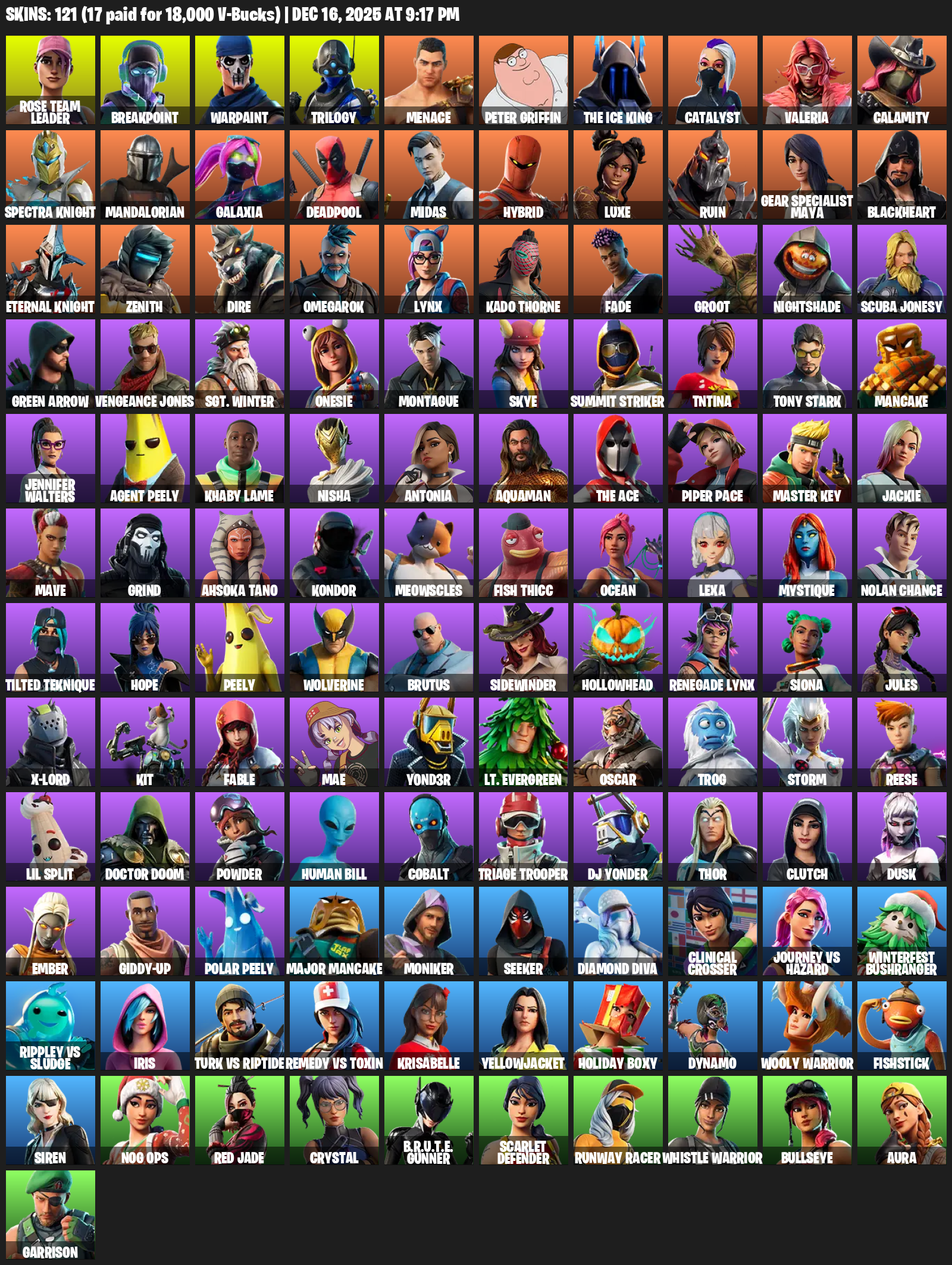Gear Specialist Maya, Rose Team Leader, Breakpoint, Warpaint, Trilogy, Menace, Peter Griffin, The Ice King, Catalyst, Valeria, Calamity, Spectra Knight, Mandalorian, Galaxia, Deadpool, Midas, Hybrid, Luxe, Ruin, Blackheart