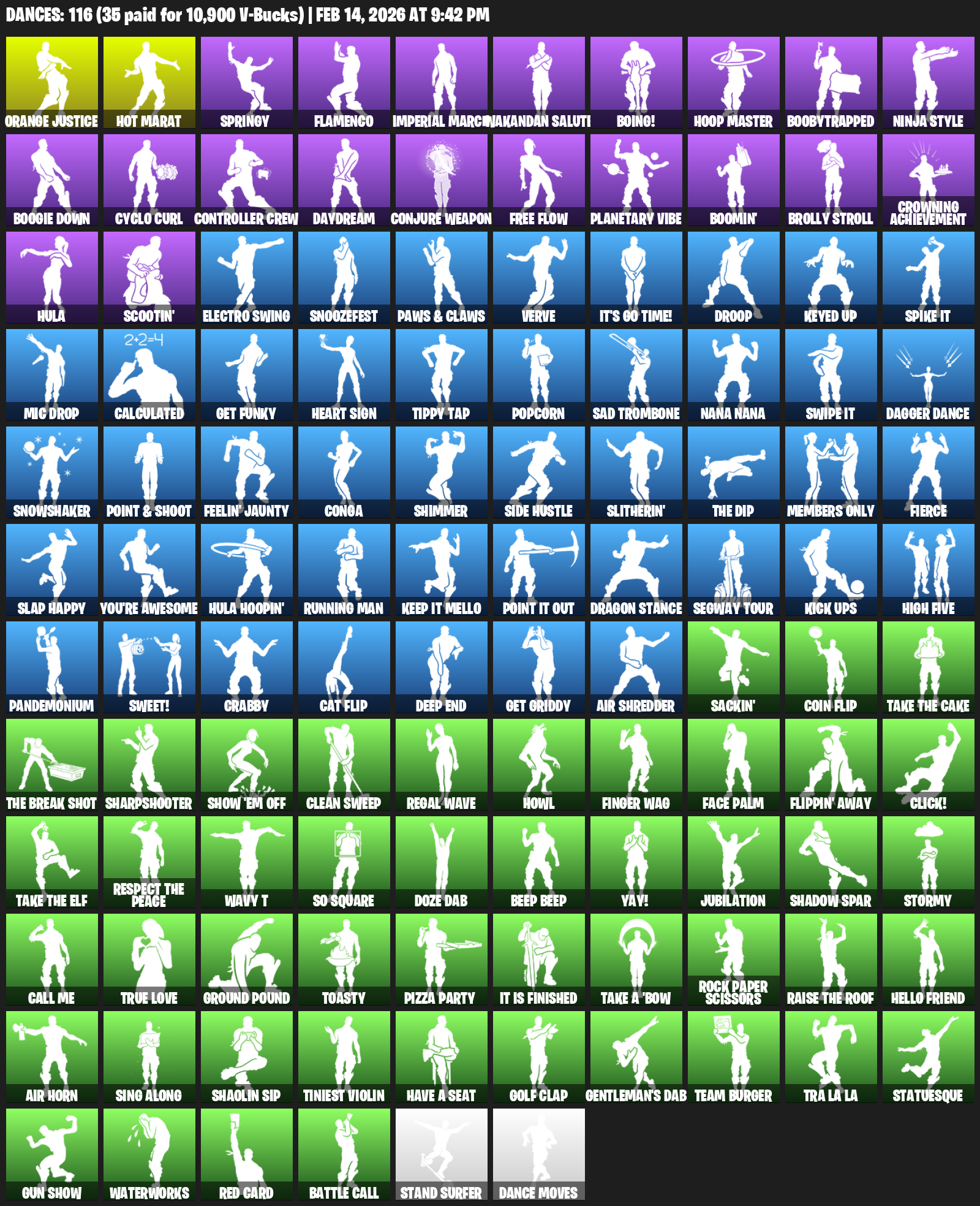 Hot Marat, Orange Justice, Springy , Flamenco, Imperial March, Wakandan Salute, Boing!, Hoop Master, Boobytrapped, Ninja Style, Boogie Down, Cyclo Curl, Controller Crew, Daydream, Conjure Weapon, Free Flow, Planetary Vibe, Boomin’, Brolly Stroll, Crowning Achievement