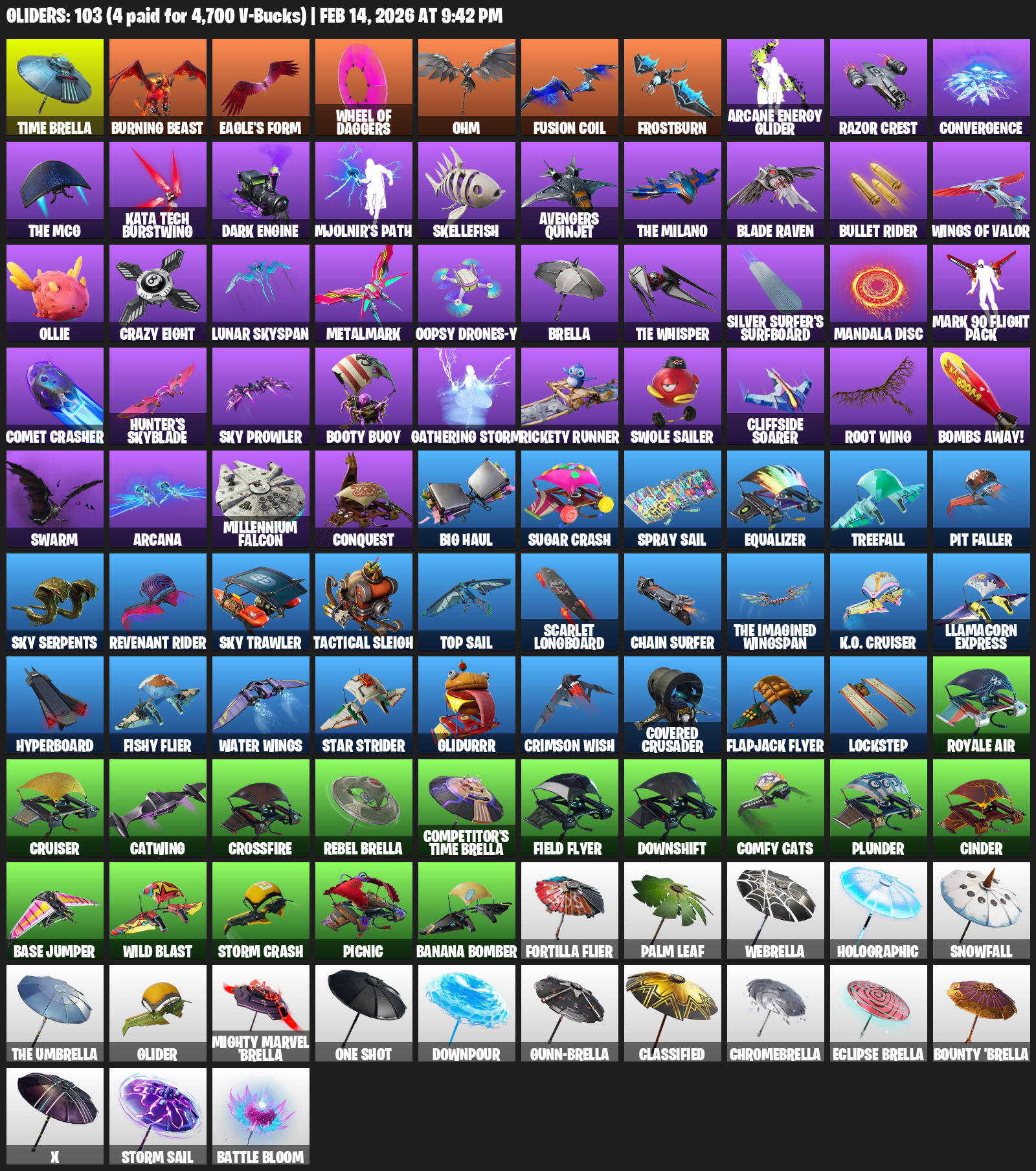 Time Brella, Burning Beast, Eagle’s Form, Ohm, Frostburn, Razor Crest, Convergence, Kata Tech Burstwing, Dark Engine, Mjolnir’s Path, Skellefish, Avengers Quinjet, Bullet Rider