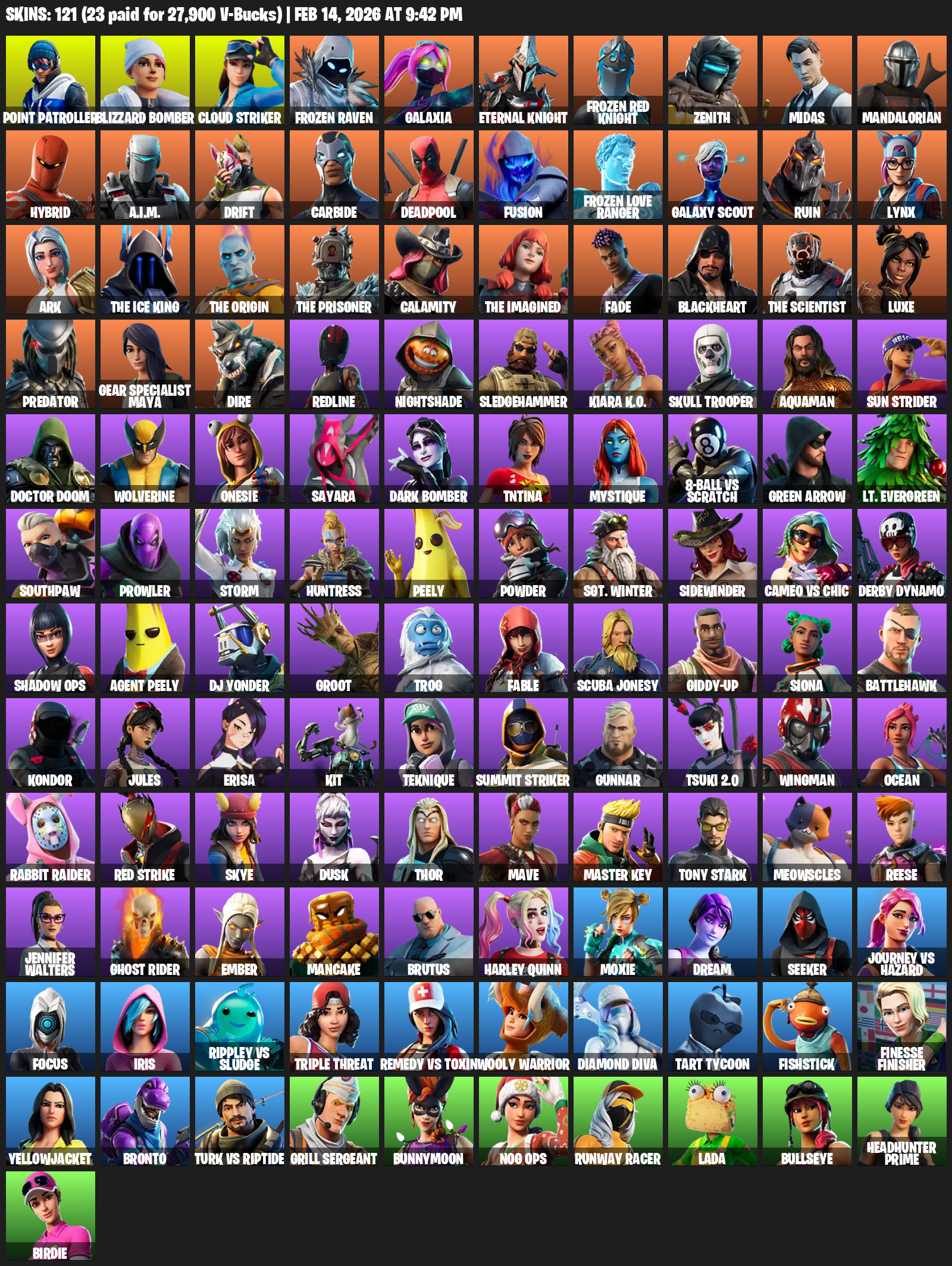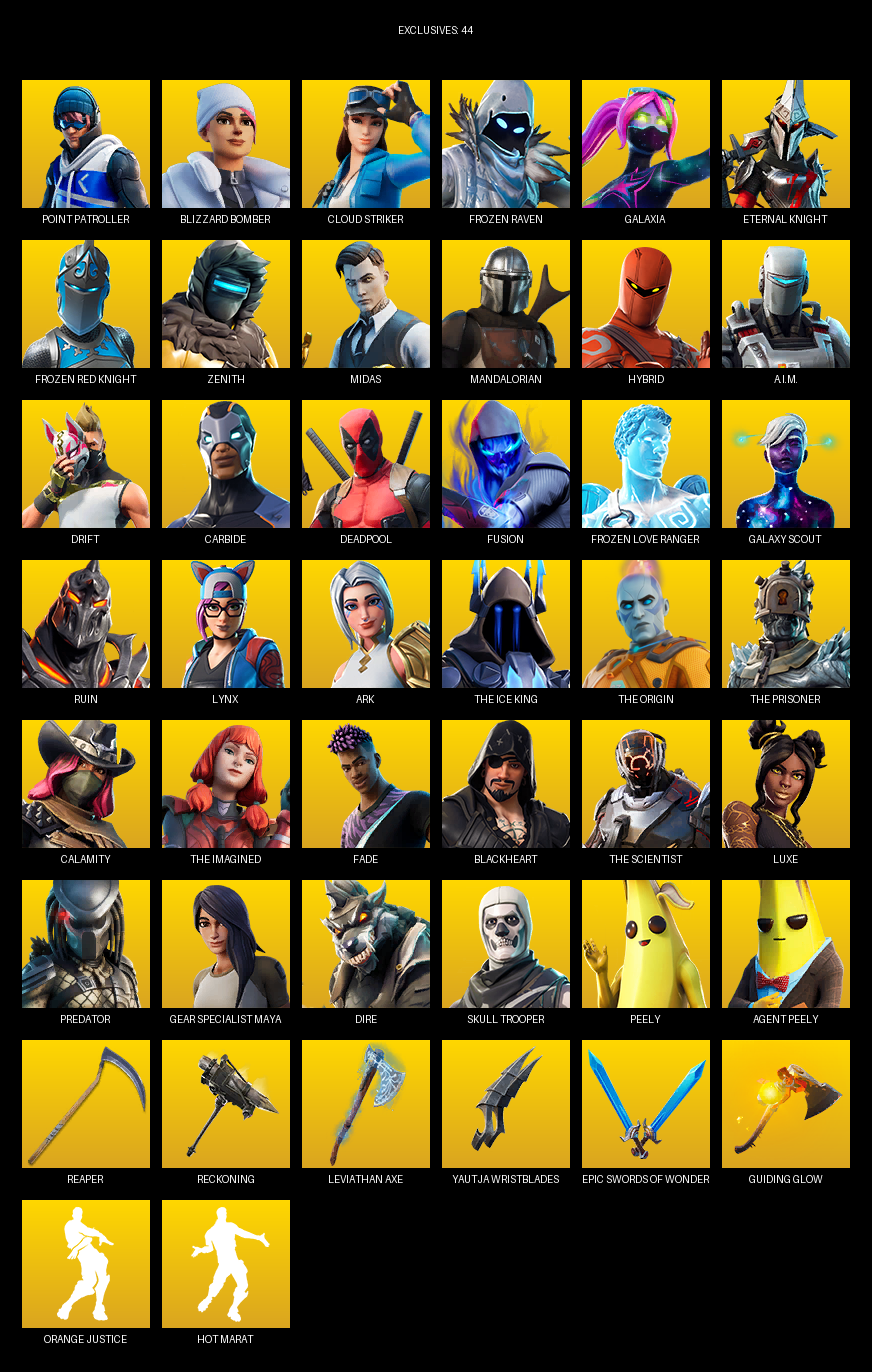 Point Patroller, Gear Specialist Maya, Blizzard Bomber, Cloud Striker, Frozen Raven, Galaxia, Eternal Knight, Zenith, Midas, Mandalorian, Hybrid, A.I.M., Drift, Carbide, Deadpool, Fusion, Galaxy Scout, Ruin