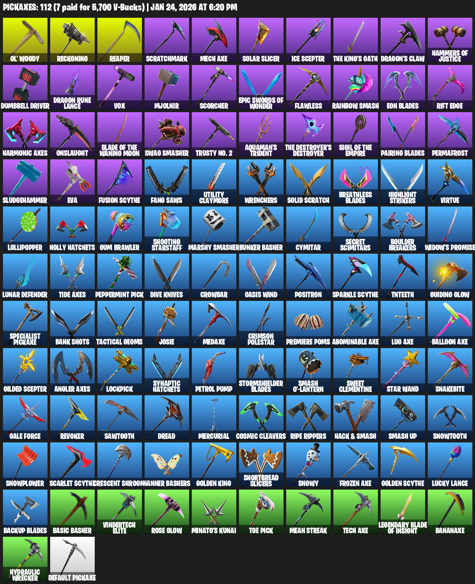 Ol’ Woody, Reckoning, Scratchmark, Mech Axe, Solar Slicer, Ice Scepter, Dragon’s Claw, Hammers of Justice, Dumbbell Driver, Dragon Rune Lance, Vox, Mjolnir, Scorcher, Flawless, Rainbow Smash, Eon Blades, Rift Edge