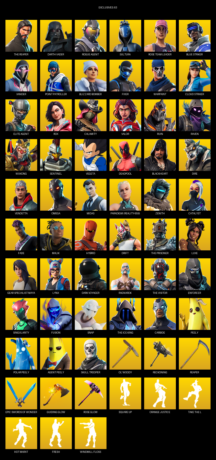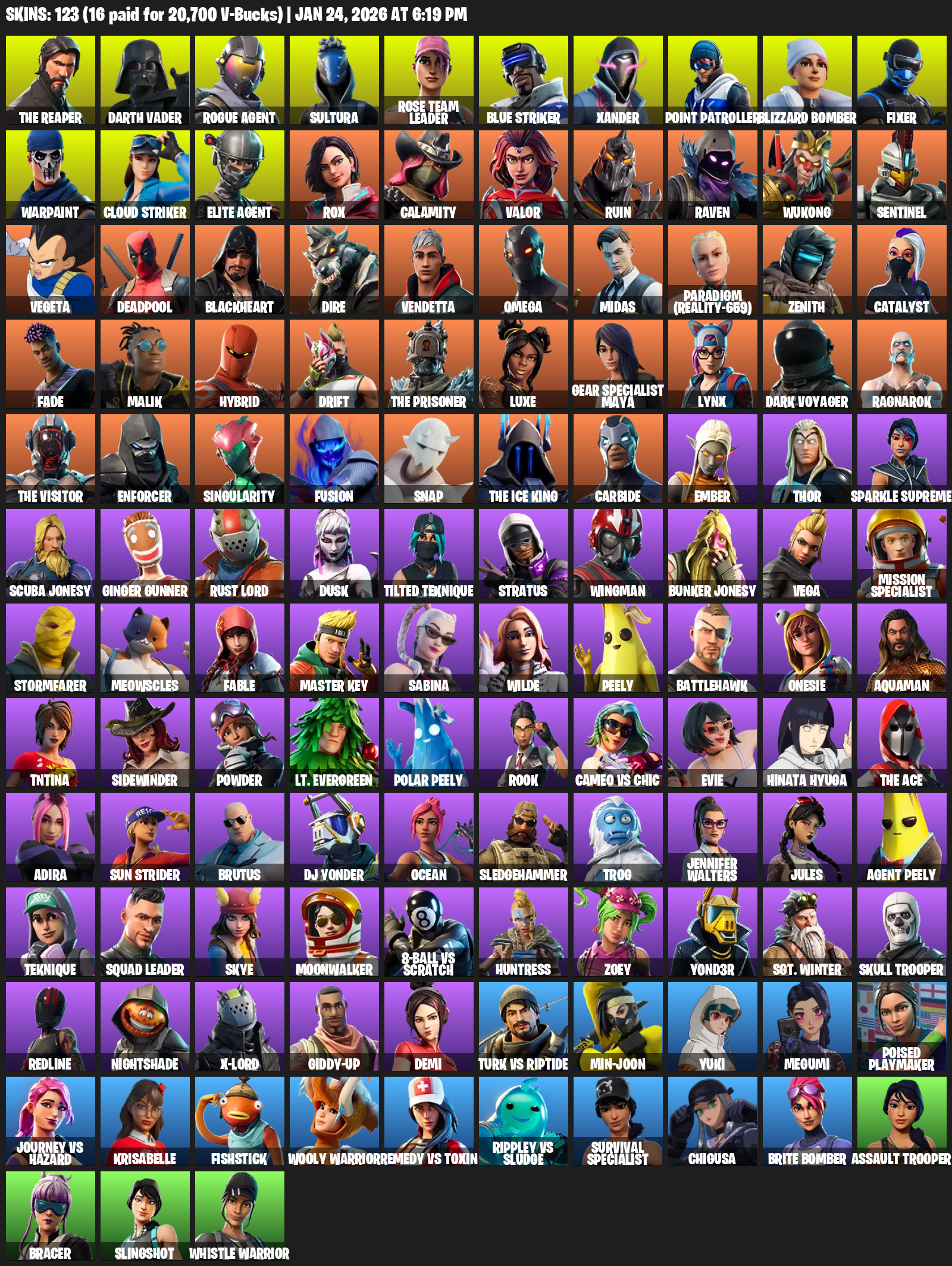 The Reaper, Point Patroller, Elite Agent, Omega, Gear Specialist Maya, Darth Vader, Sultura, Rose Team Leader, Blue Striker, Xander, Blizzard Bomber, Fixer, Warpaint, Rox, Calamity, Valor, Ruin, Raven
