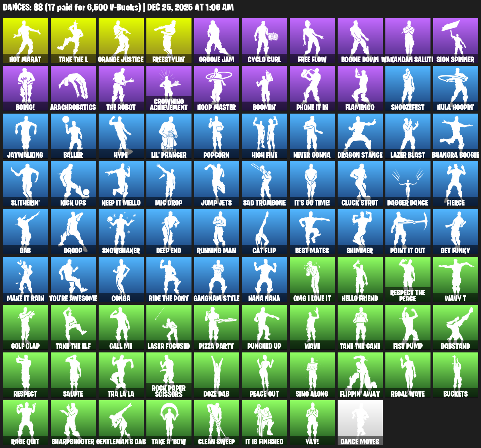 Hot Marat, Freestylin’, Groove Jam, Cyclo Curl, Free Flow, Boogie Down, Wakandan Salute, Sign Spinner, Boing!, Arachrobatics, Crowning Achievement, Hoop Master, Boomin’, Phone It In, Flamenco, Snoozefest, Hula Hoopin’