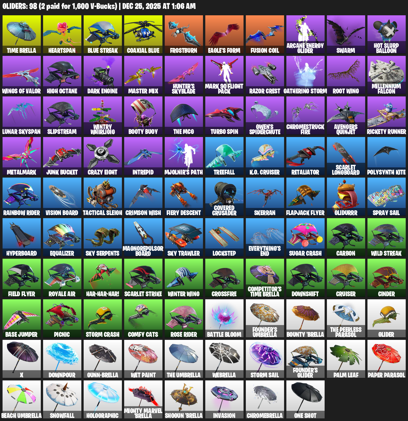Time Brella, Heartspan, Frostburn, Eagle’s Form, Swarm, High Octane, Dark Engine, Hunter’s Skyblade, Razor Crest, Gathering Storm, Root Wing, Millennium Falcon