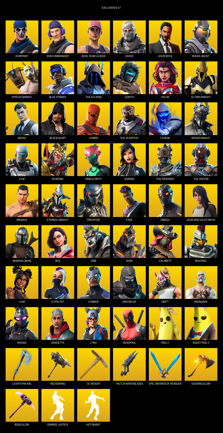 Omega, Gear Specialist Maya, Warpaint, Sub Commander, Rose Team Leader, Havoc, John Wick, Rogue Agent, Psycho Bandit, Blue Striker, The Ice King, Zenith, Valor, Ultima Knight, Midas, Blackheart, Hybrid, Fusion