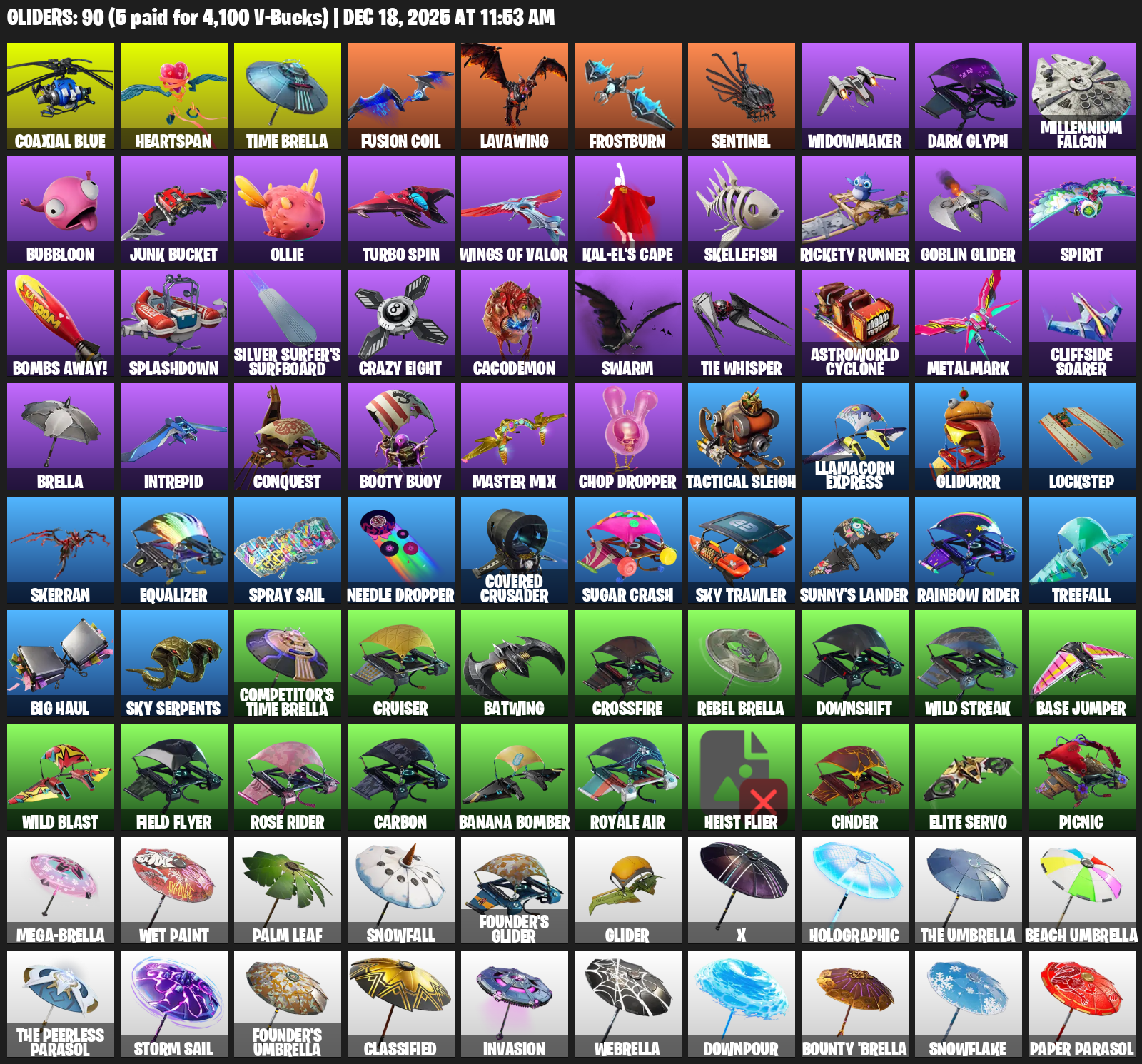 Heartspan, Time Brella, Fusion Coil, Lavawing, Frostburn, Sentinel, Widowmaker, Dark Glyph, Millennium Falcon, Bubbloon, Junk Bucket, Ollie, Turbo Spin, Kal-El’s Cape, Skellefish, Rickety Runner, Goblin Glider, Spirit