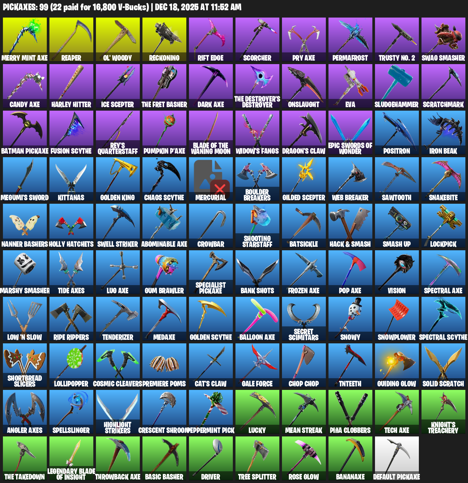 Merry Mint Axe, Ol’ Woody, Reckoning, Rift Edge, Scorcher, Permafrost, Trusty No. 2, Swag Smasher, Harley Hitter, Ice Scepter, Onslaught, EVA, Sludgehammer, Scratchmark