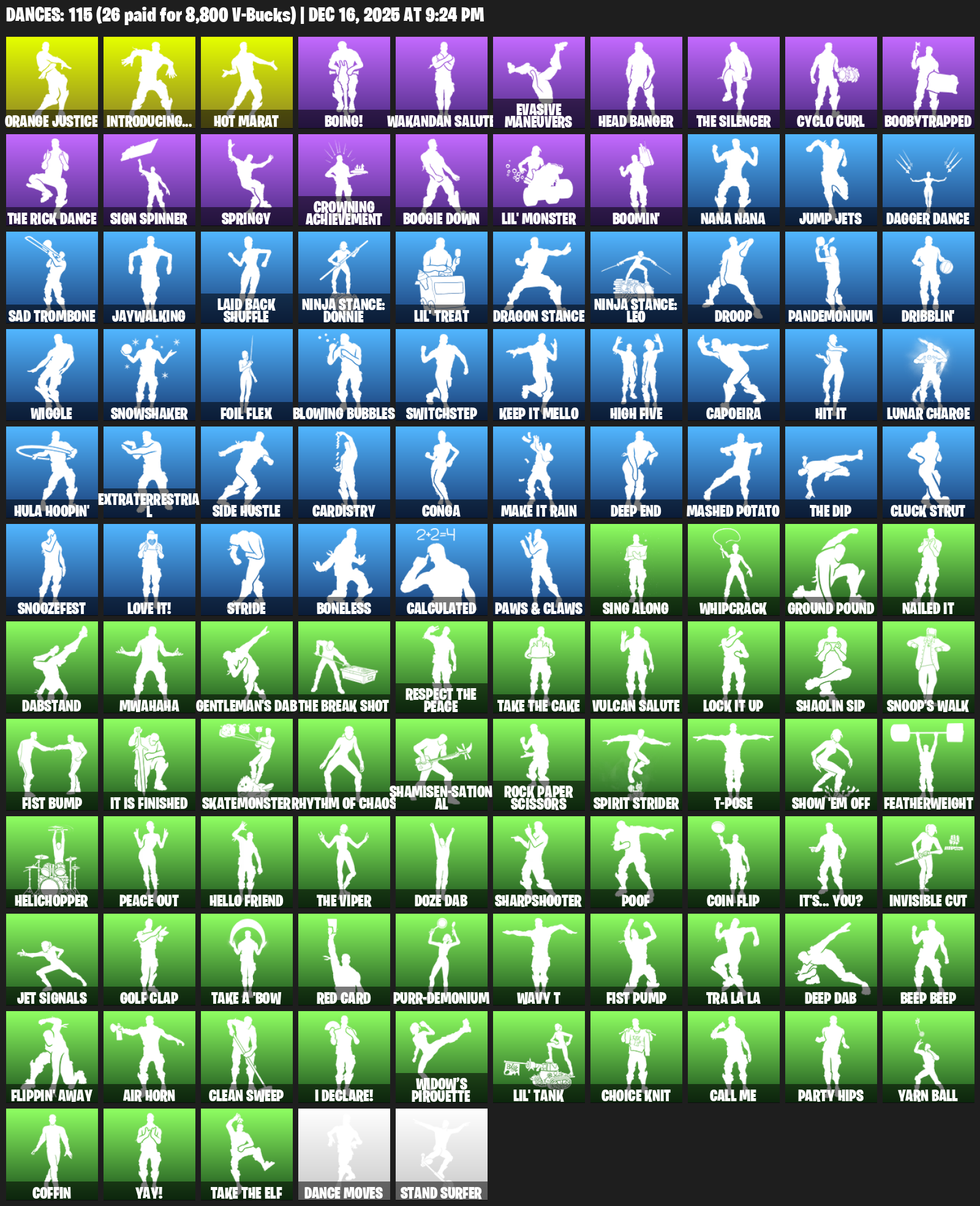 Introducing…, Hot Marat, Orange Justice, Boing!, Wakandan Salute, Evasive Maneuvers, Head Banger, Cyclo Curl, Boobytrapped, Sign Spinner, Springy, Crowning Achievement, Boogie Down, Lil’ Monster, Boomin’, Nana Nana, Jump Jets, Dagger Dance