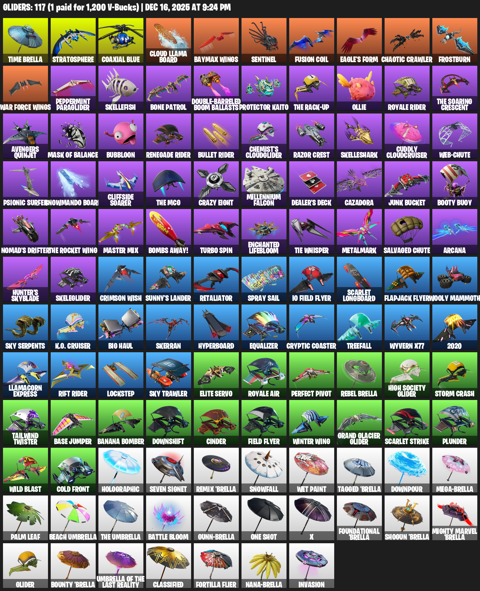 Time Brella, Stratosphere, Coaxial Blue, Baymax Wings, Eagle’s Form, Chaotic Crawler, Frostburn, Peppermint Paraglider, Skellefish, Bone Patrol, Double-Barreled Boom Ballasts, Protector Kaito, Ollie, Royale Rider