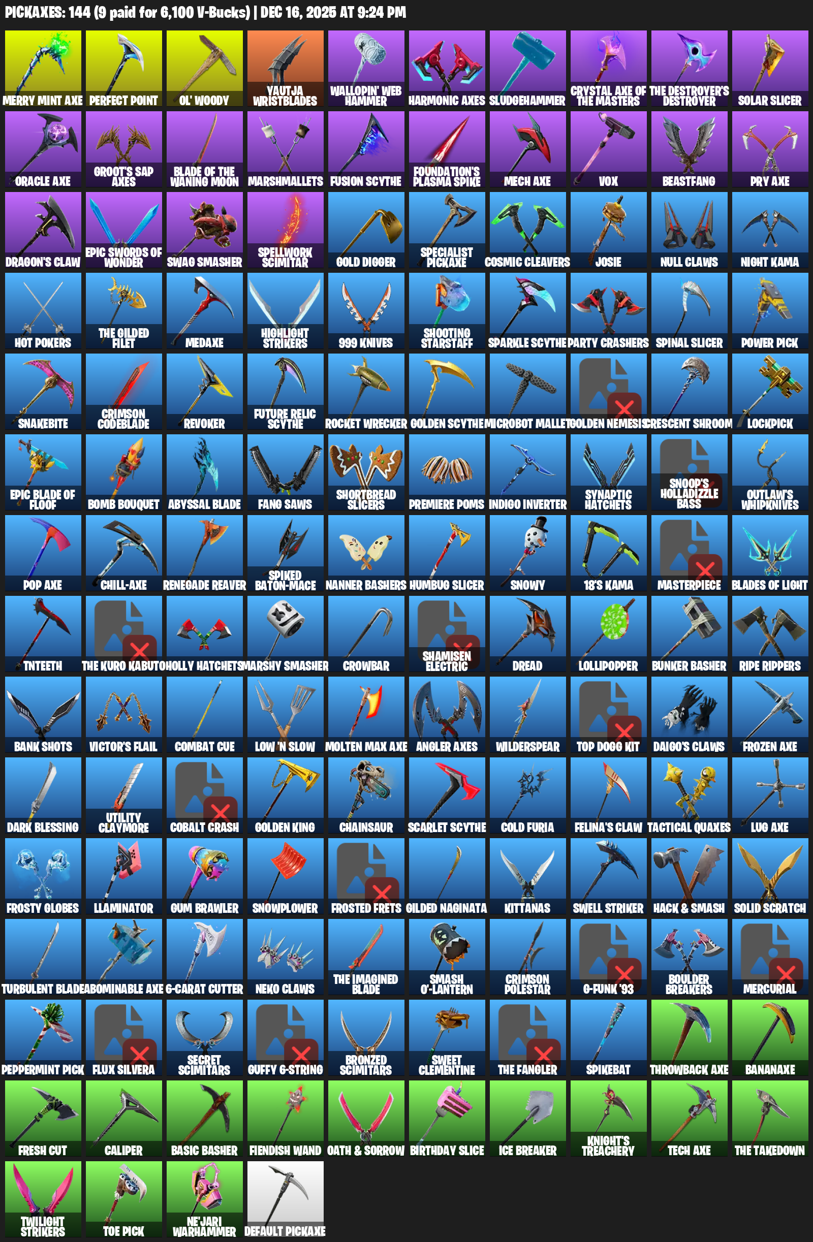 Merry Mint Axe, Ol’ Woody, Yautja Wristblades, Wallopin’ Web Hammer, Harmonic Axes, Sludgehammer, Solar Slicer, Marshmallets, Fusion Scythe, Foundation’s Plasma Spike, Vox, Beastfang