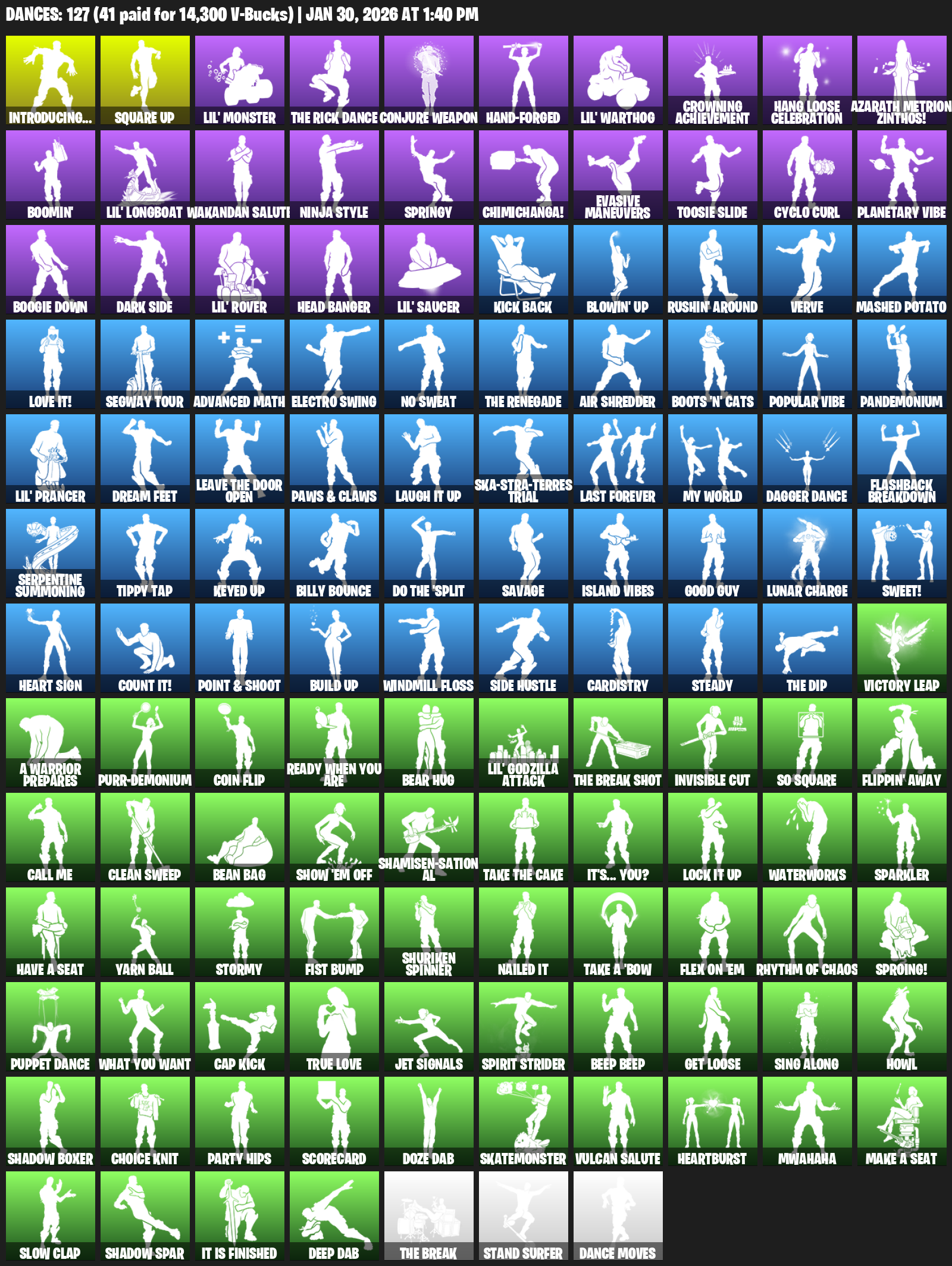 Introducing…, Square Up, Lil’ Monster, Conjure Weapon, Hand-Forged, Crowning Achievement, Hang Loose Celebration, Azarath Metrion Zinthos!, Boomin’, Wakandan Salute, Ninja Style, Springy, Chimichanga!, Evasive Maneuvers, Toosie Slide, Cyclo Curl, Planetary Vibe