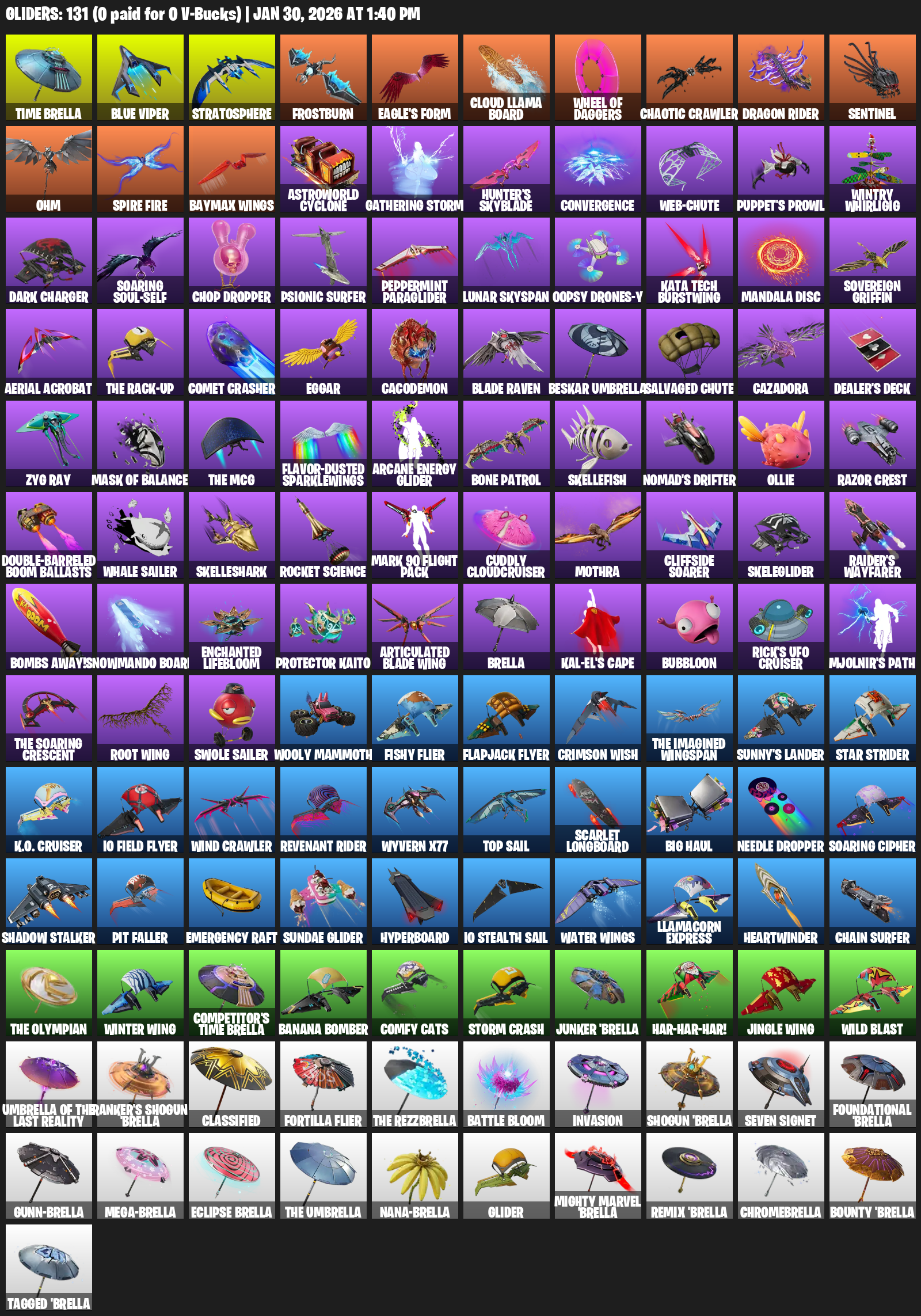 Time Brella, Blue Viper, Stratosphere, Frostburn, Eagle’s Form, Chaotic Crawler, Dragon Rider, Sentinel, Ohm, Baymax Wings, Astroworld Cyclone, Gathering Storm, Hunter’s Skyblade, Convergence, Web-Chute, Puppet’s Prowl, Wintry Whirligig