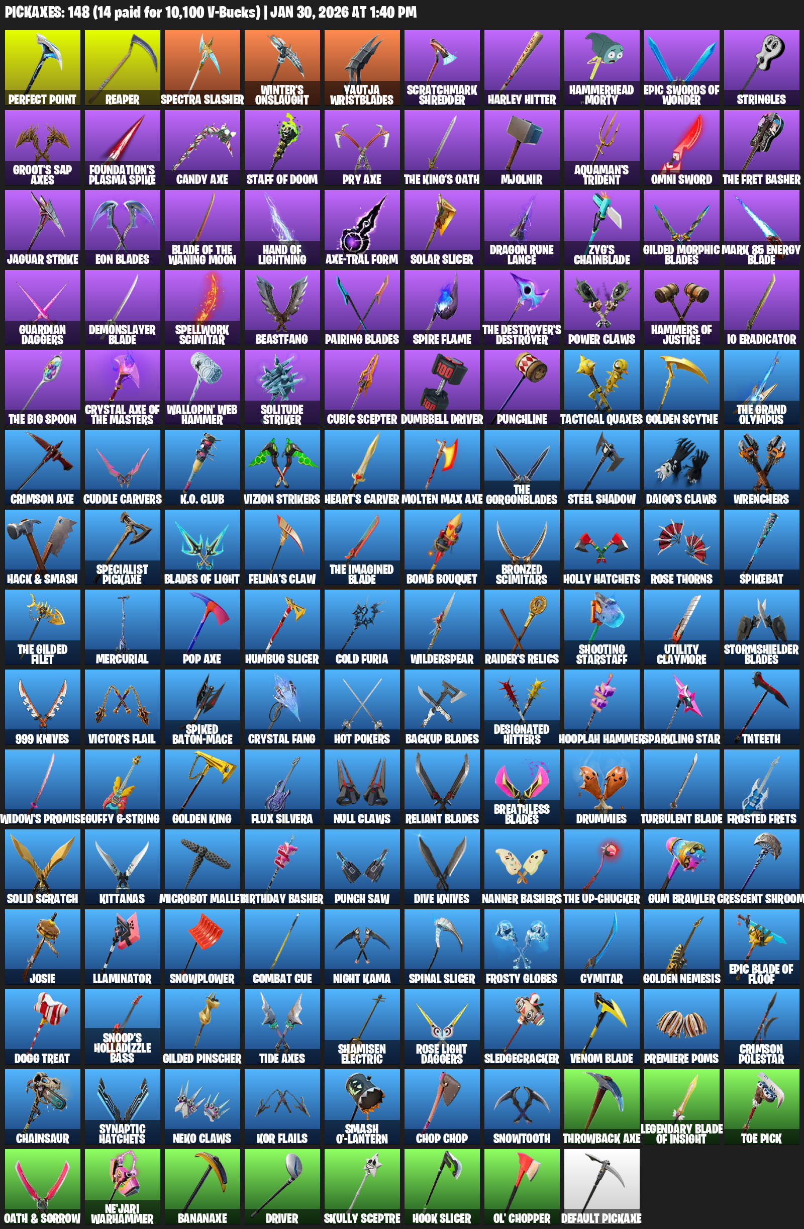 Perfect Point, Reaper, Spectra Slasher, Winter’s Onslaught, Yautja Wristblades, Scratchmark Shredder, Harley Hitter, Hammerhead Morty, Stringles, Groot’s Sap Axes, Foundation’s Plasma Spike, Candy Axe, Staff of Doom, Mjolnir, Aquaman’s Trident, Omni Sword