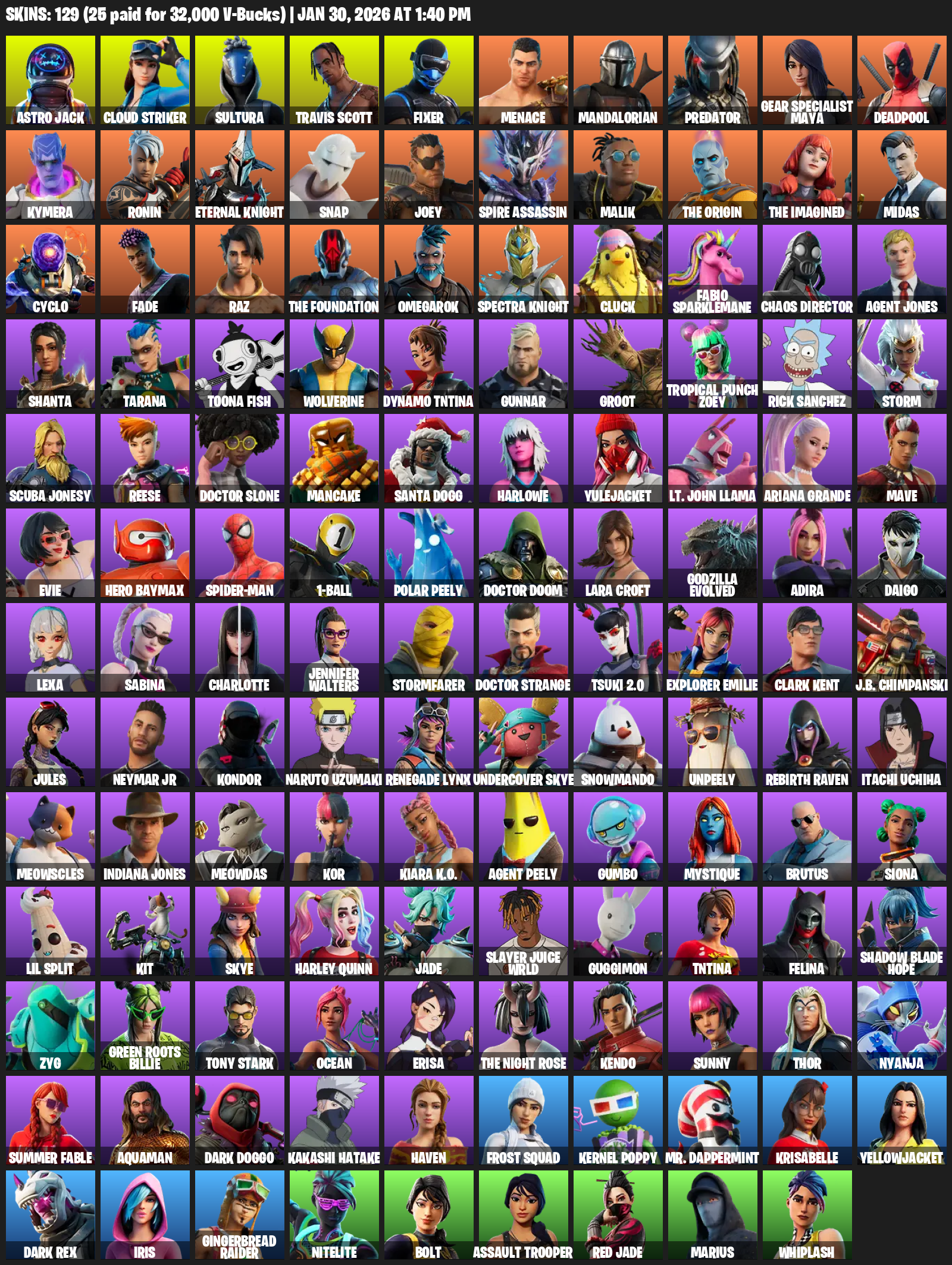 Travis Scott, Gear Specialist Maya, Lara Croft, Astro Jack, Cloud Striker, Sultura, Fixer, Menace, Mandalorian, Predator, Deadpool, Kymera, Ronin, Eternal Knight, Snap, Joey, Spire Assassin, Malik, The Origin