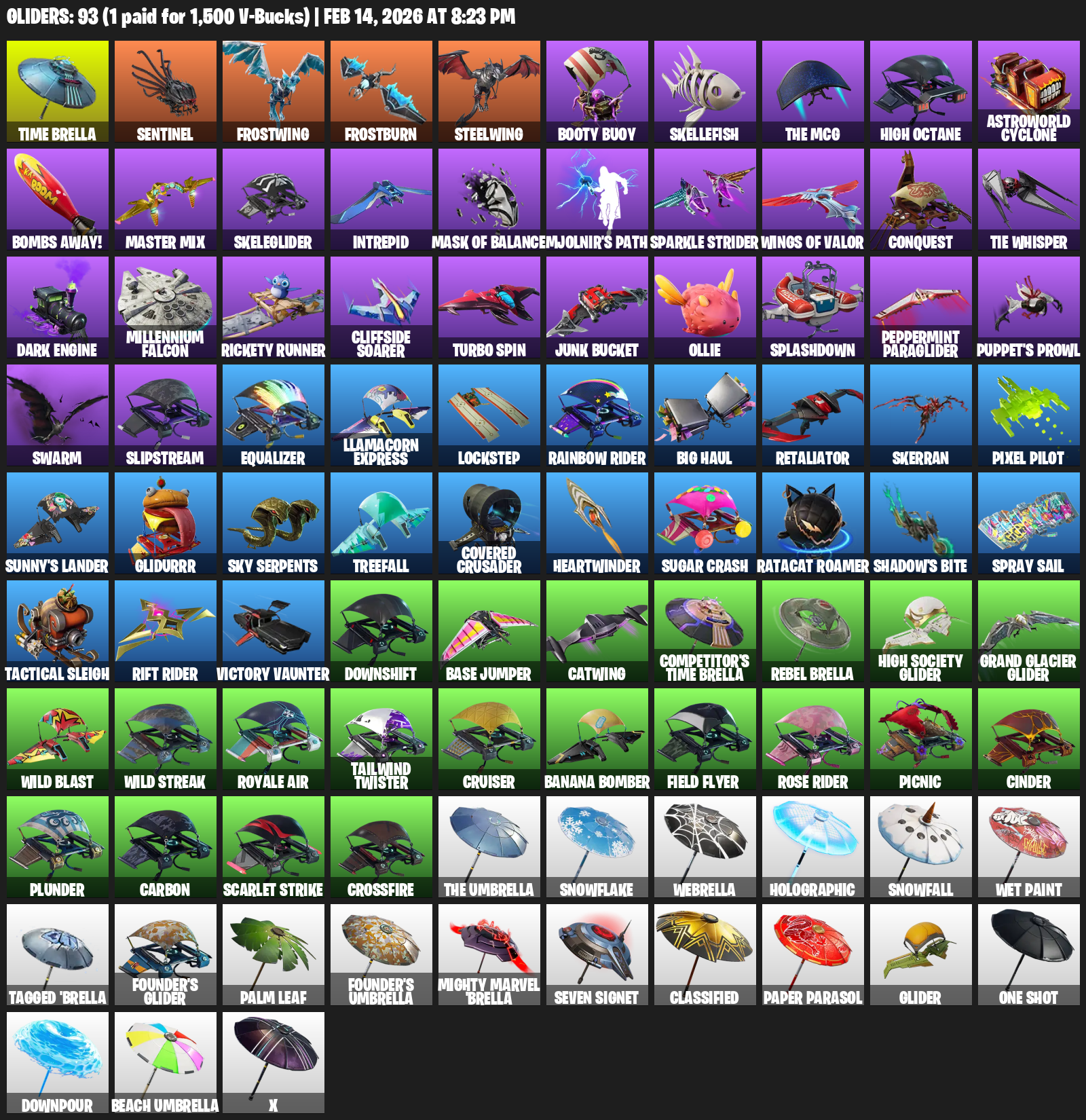 Time Brella, Frostwing, Frostburn, Steelwing, Booty Buoy, Skellefish, High Octane, Astroworld Cyclone, Bombs Away!, Skeleglider, Intrepid, Mjolnir’s Path, Sparkle Strider, Conquest, TIE Whisper