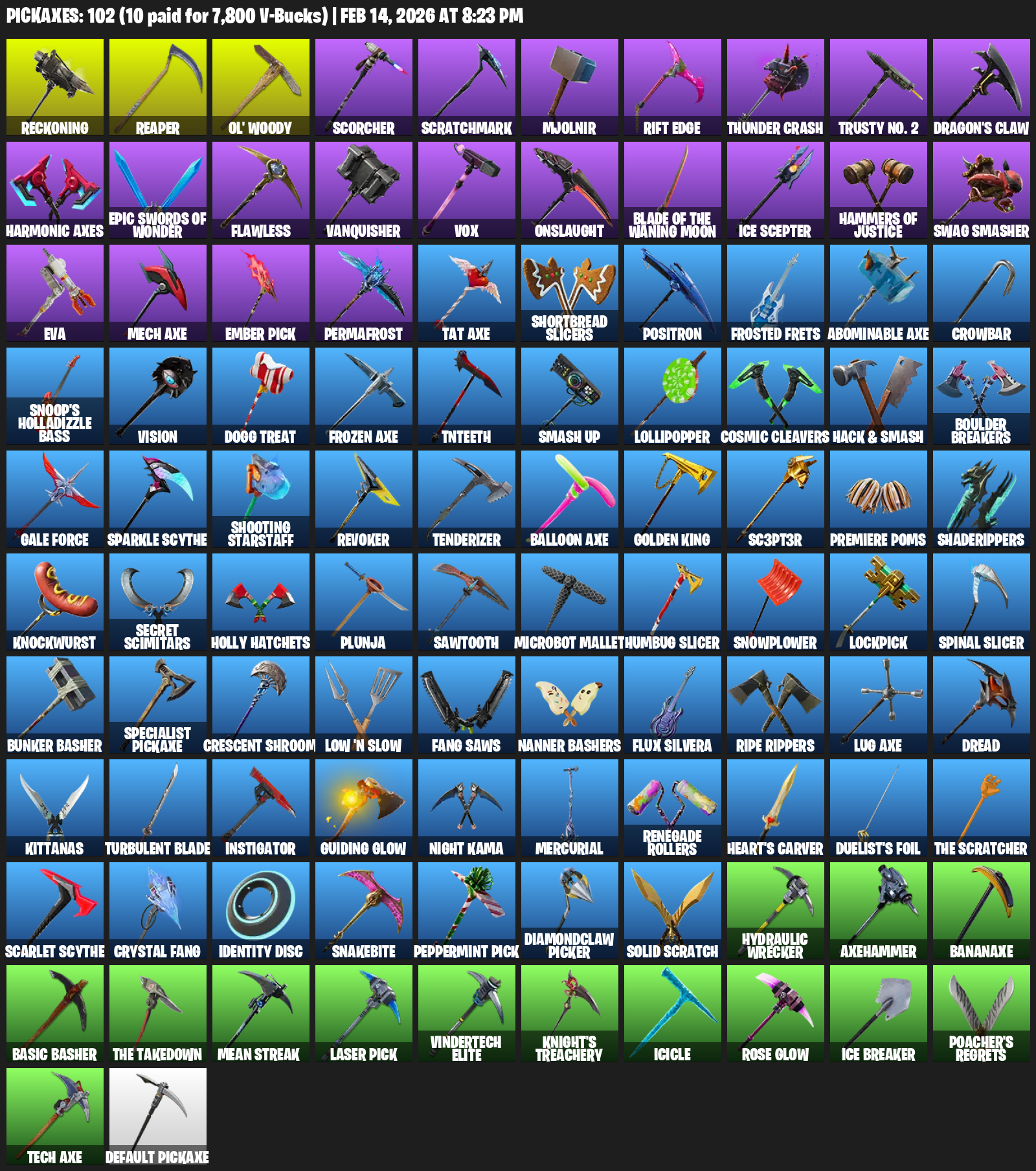 Reckoning, Ol’ Woody, Scorcher, Scratchmark, Mjolnir, Rift Edge, Thunder Crash, Trusty No. 2, Dragon’s Claw, Harmonic Axes, Flawless, Vanquisher, Vox, Onslaught, Ice Scepter, Hammers of Justice, Swag Smasher