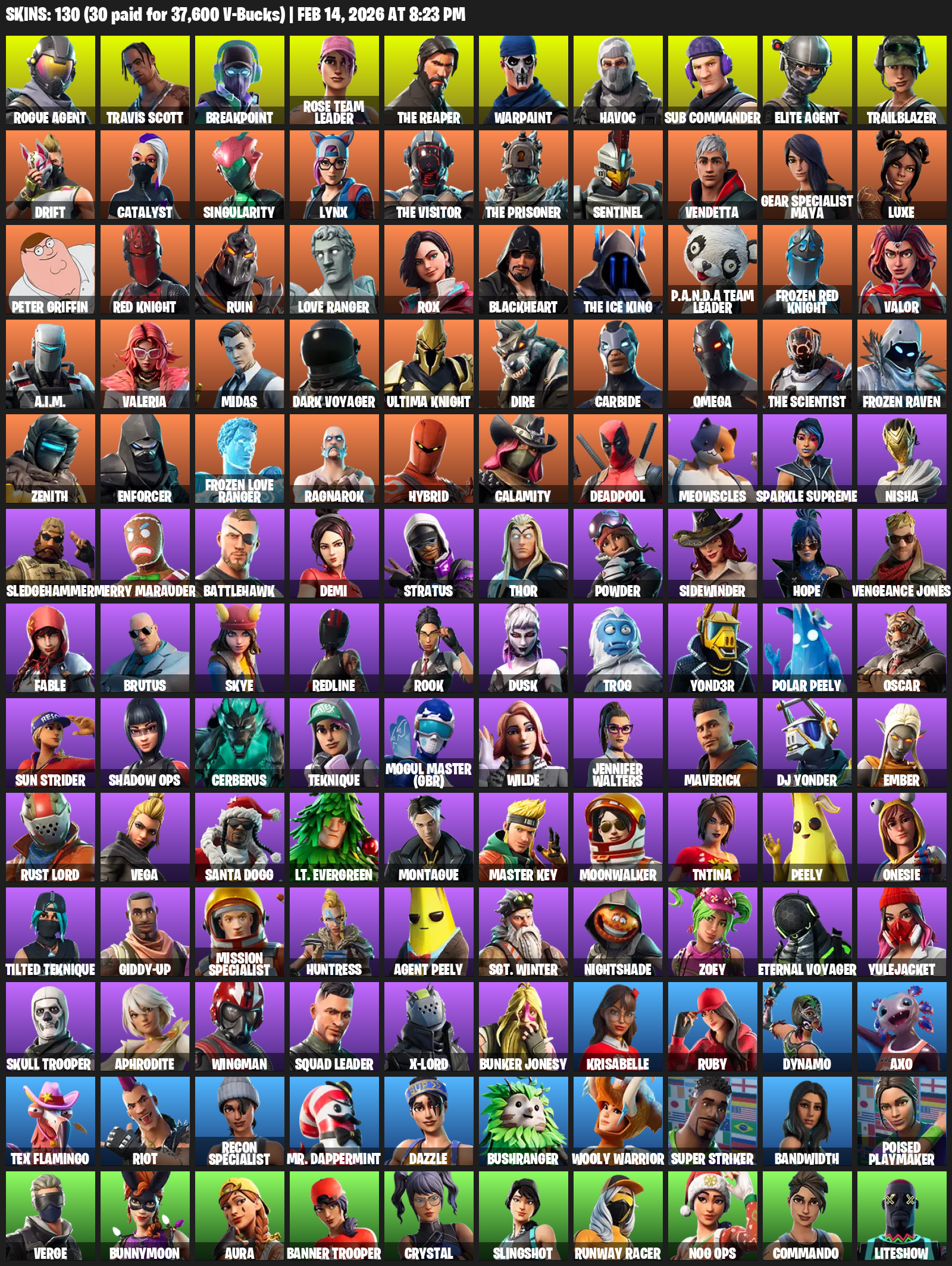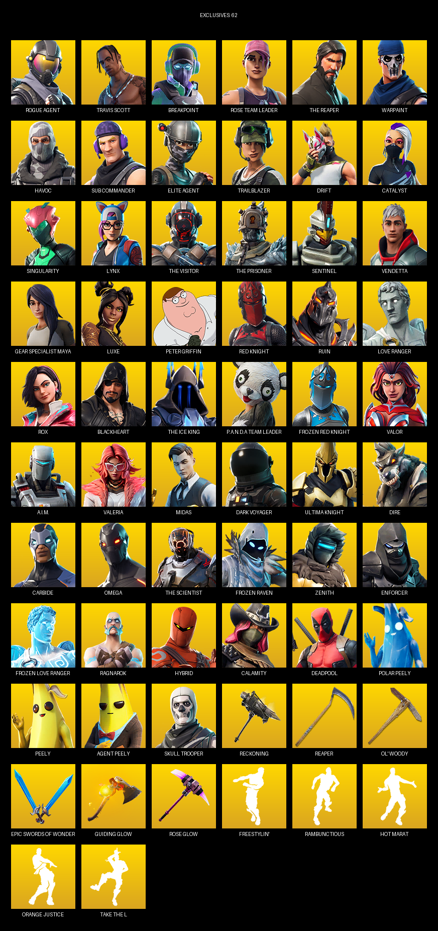 Travis Scott, The Reaper, Elite Agent, Gear Specialist Maya, Omega, Breakpoint, Rose Team Leader, Warpaint, Havoc, Sub Commander, Trailblazer, Drift, Catalyst, Singularity, Lynx, Sentinel, Vendetta