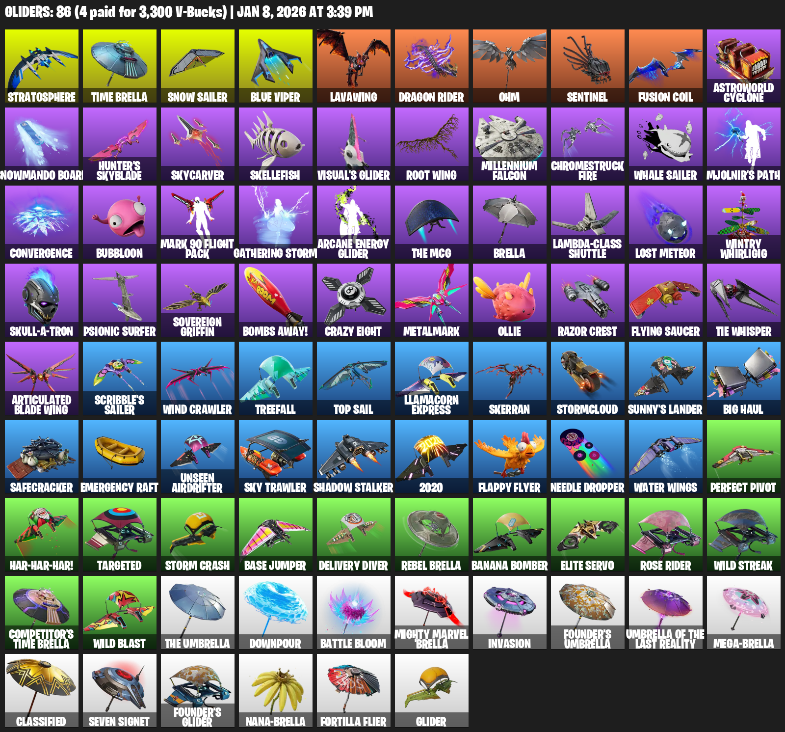 Stratosphere, Time Brella, Snow Sailer, Blue Viper, Lavawing, Dragon Rider, Ohm, Sentinel, Astroworld Cyclone, Snowmando Board, Hunter’s Skyblade, Skycarver, Skellefish, Visual’s Glider, Root Wing, Millennium Falcon, Chromestruck Fire, Mjolnir’s Path