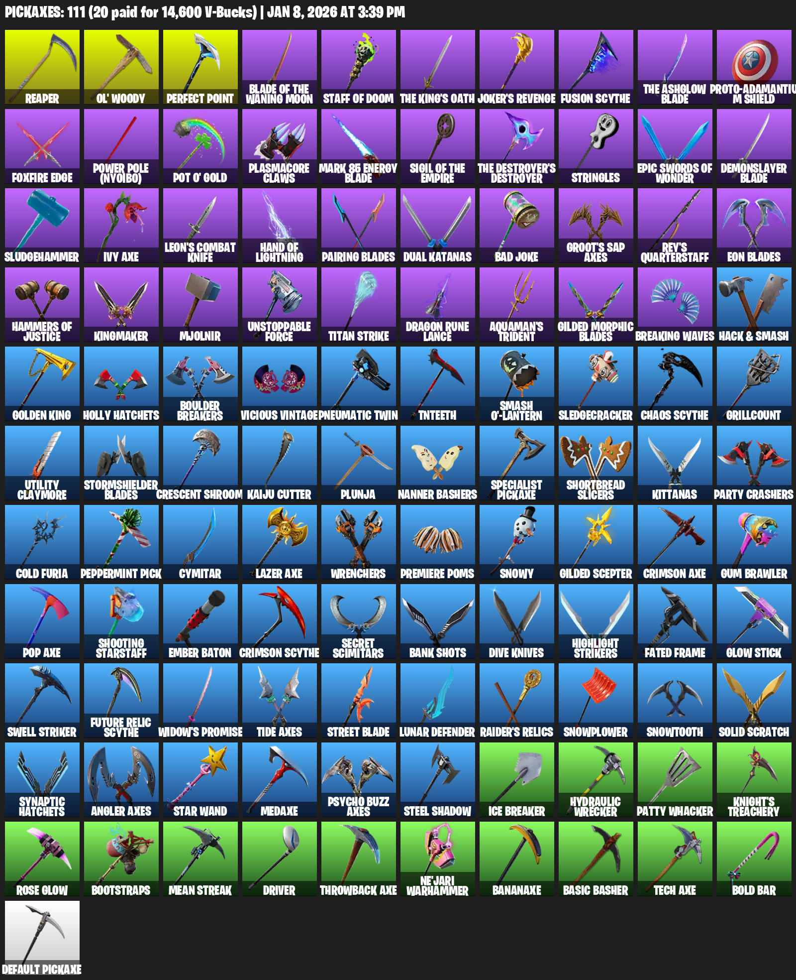 Reaper, Ol’ Woody, Staff of Doom, Joker’s Revenge, Fusion Scythe, Proto-Adamantium Shield, Foxfire Edge, Power Pole (Nyoibo), Pot O’ Gold, Plasmacore Claws, Mark 85 Energy Blade, Stringles