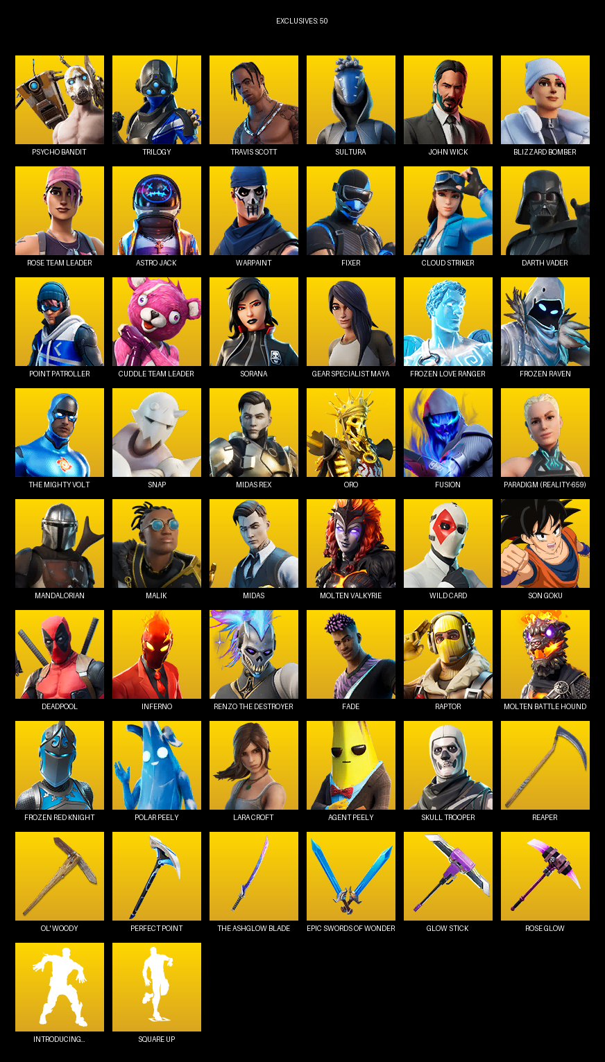 Travis Scott, Point Patroller, Gear Specialist Maya, Lara Croft, Psycho Bandit, Trilogy, Sultura, John Wick, Blizzard Bomber, Rose Team Leader, Astro Jack, Warpaint, Fixer, Cloud Striker, Darth Vader, Sorana, Frozen Love Ranger, The Mighty Volt